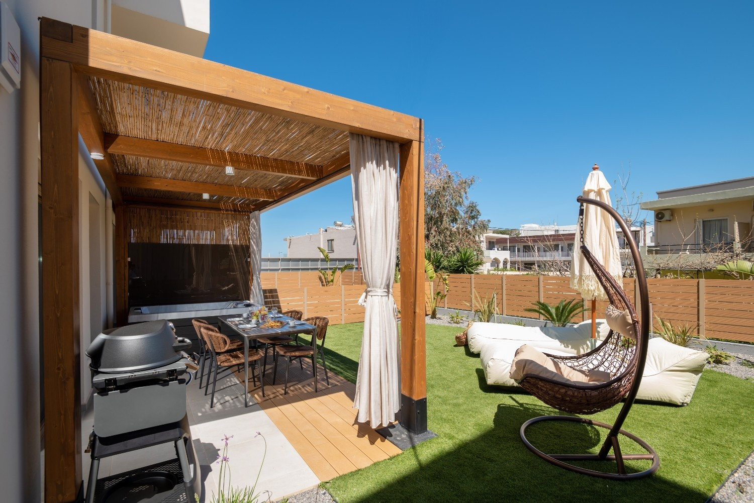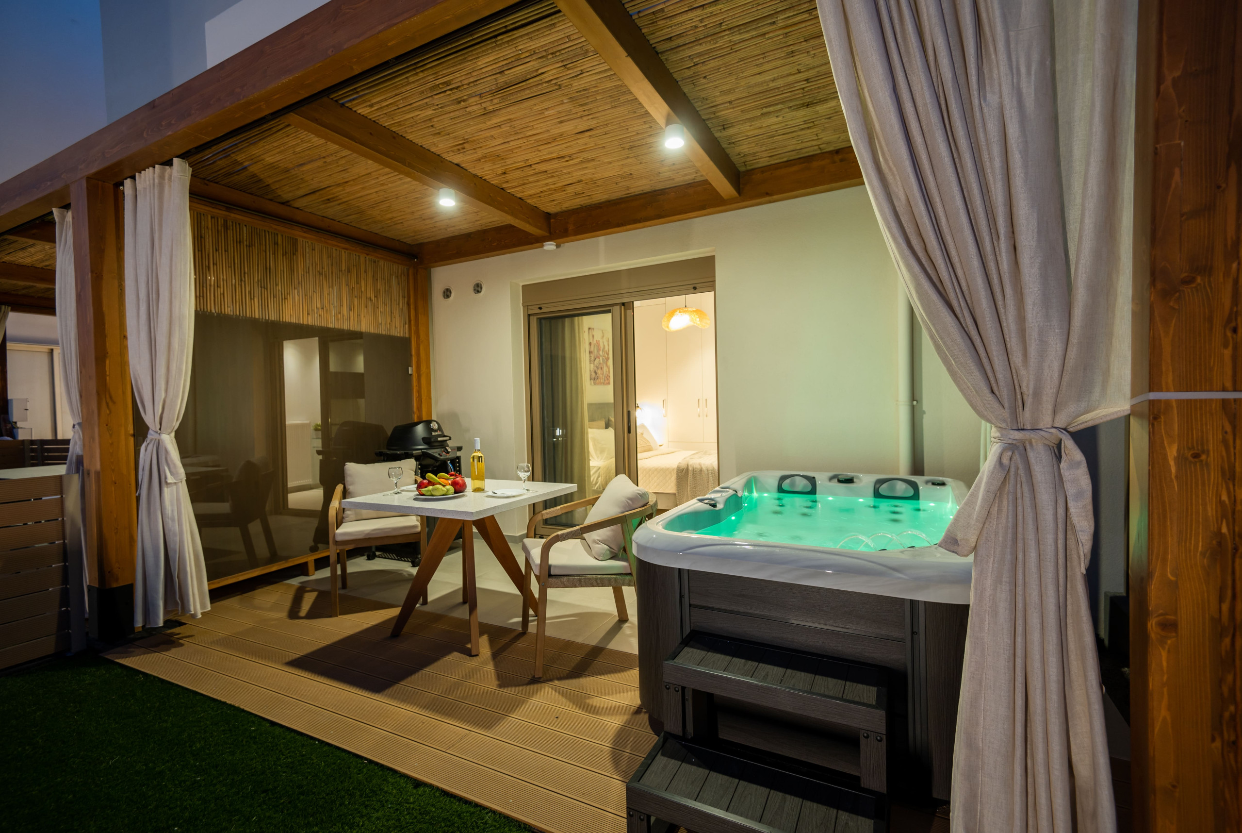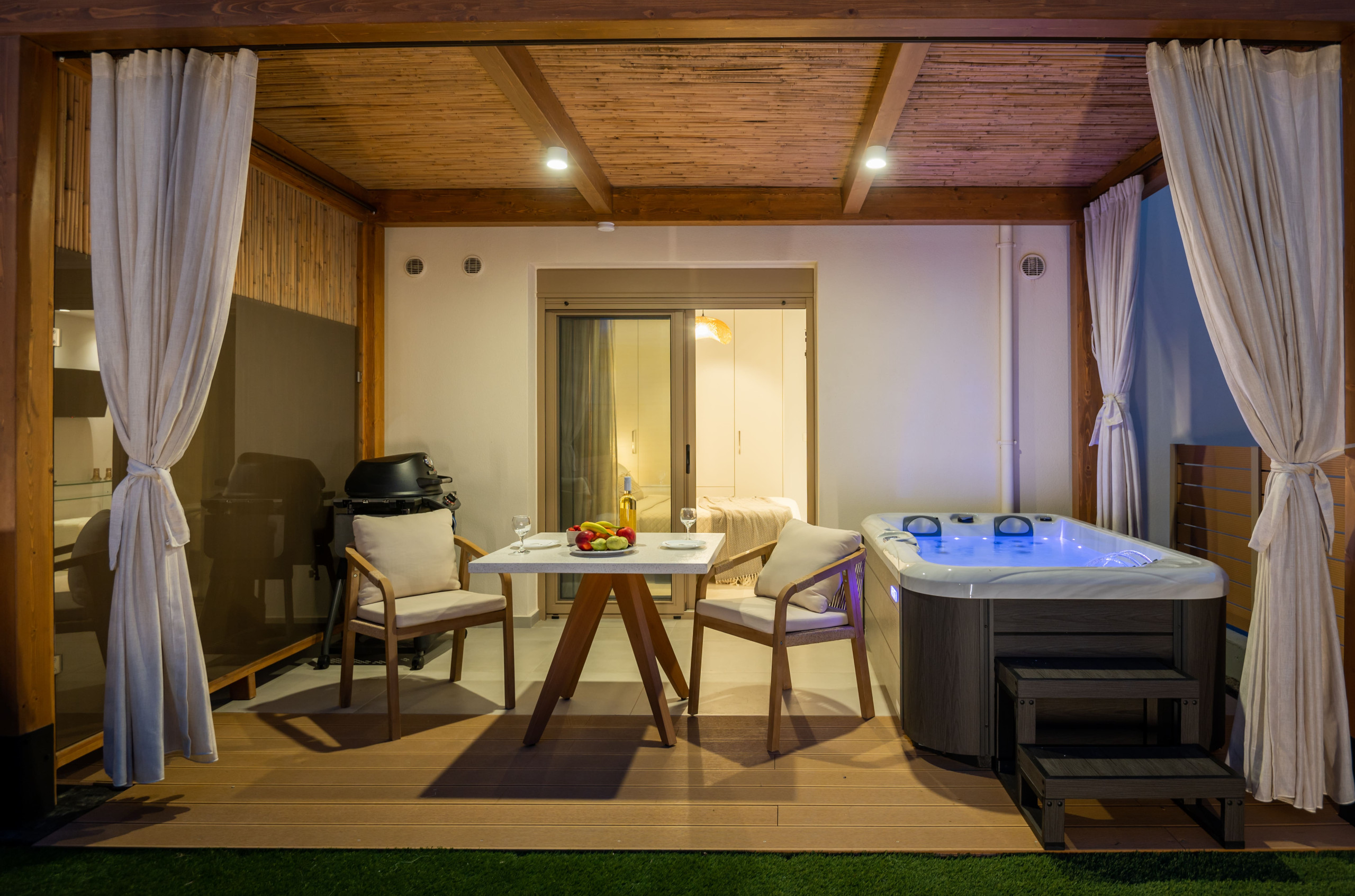 Outdoor: Private patio with a freestanding heated hot tub and hanging swing chair.
