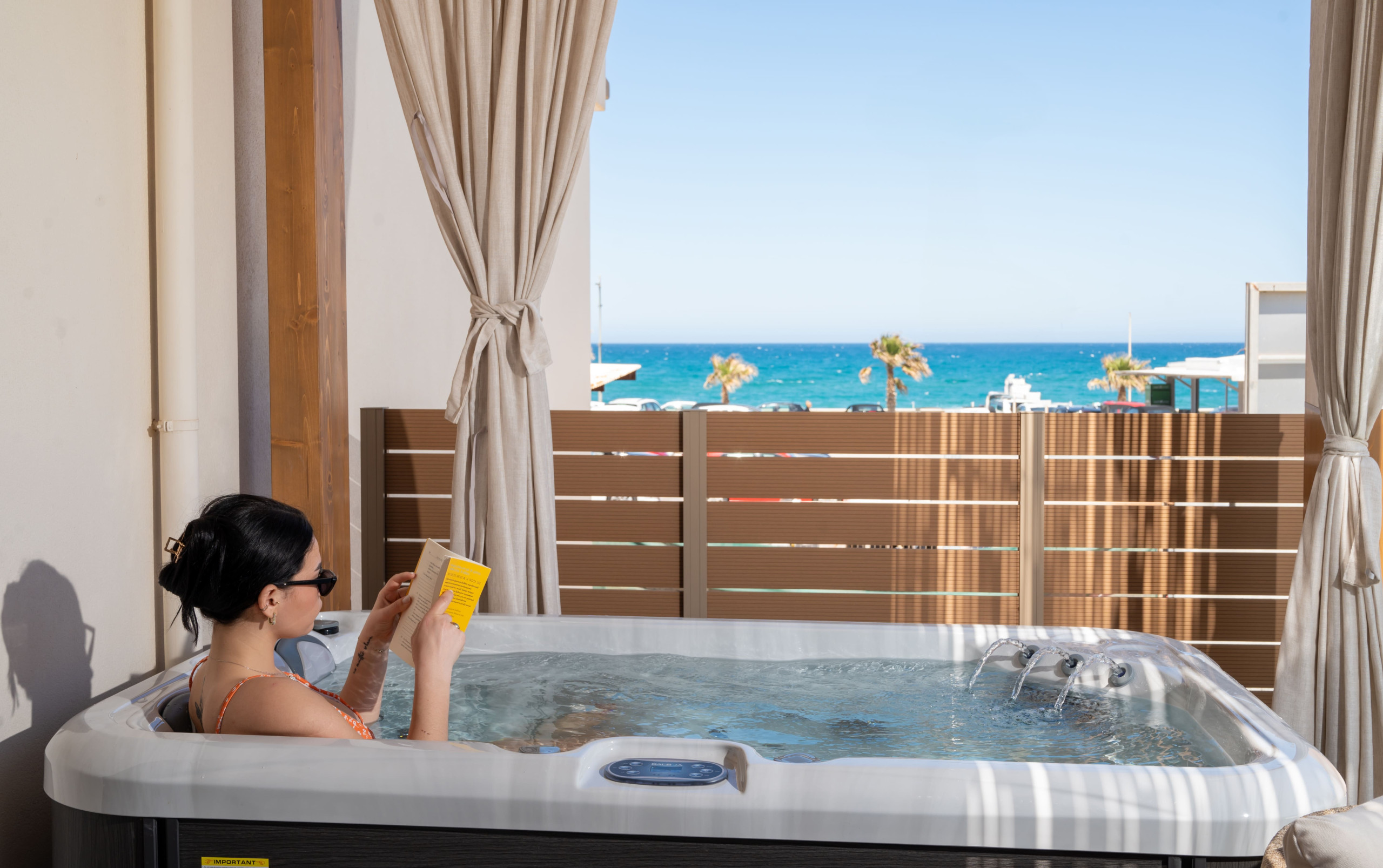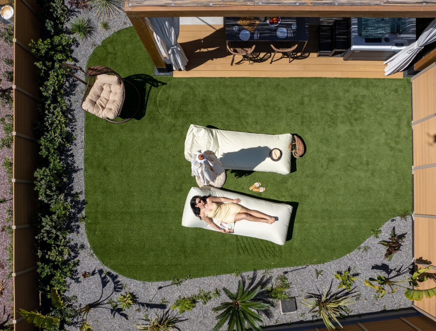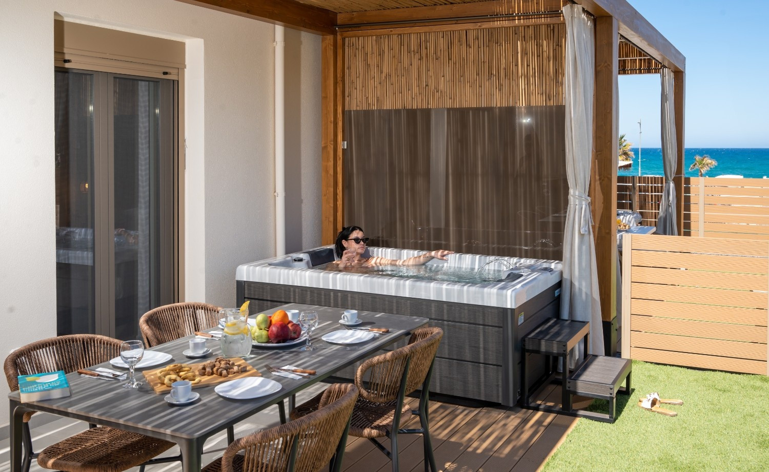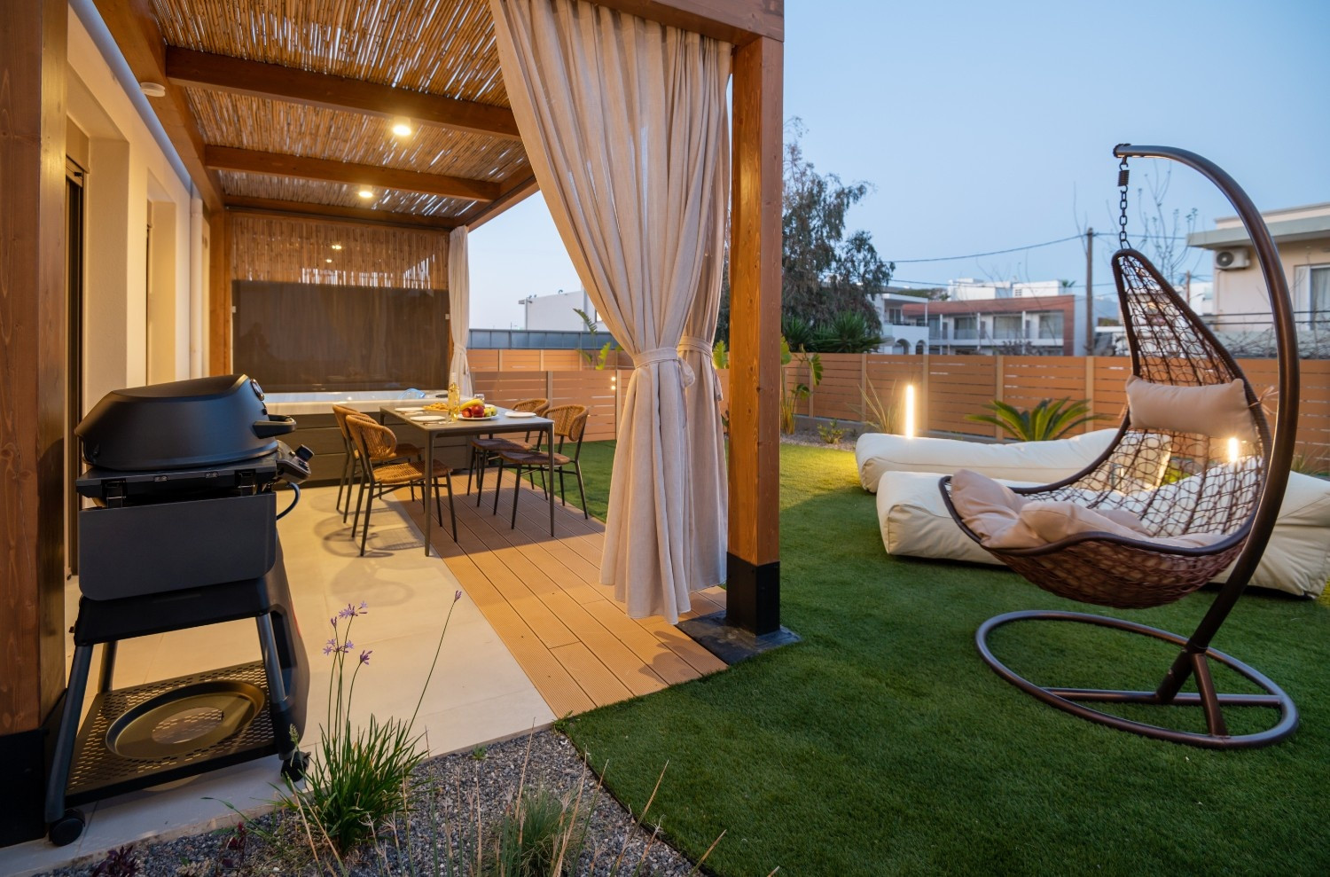 Outdoor: Private patio with a freestanding heated hot tub and hanging swing chair.