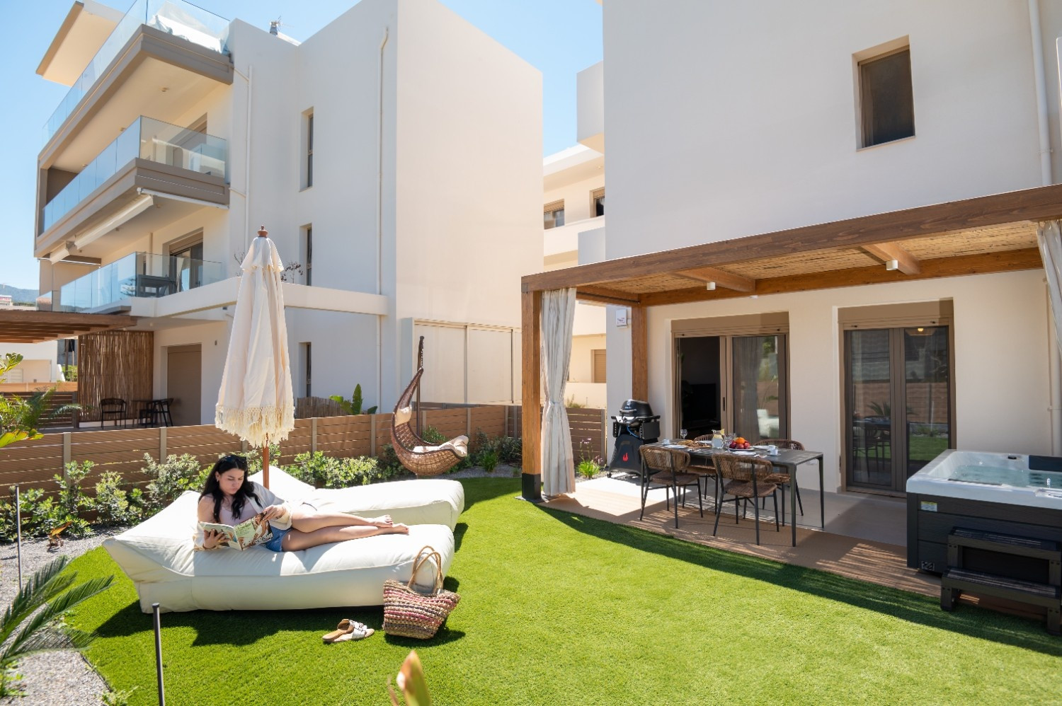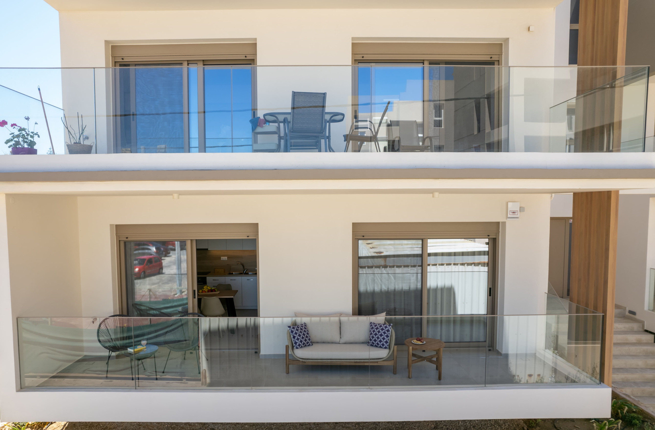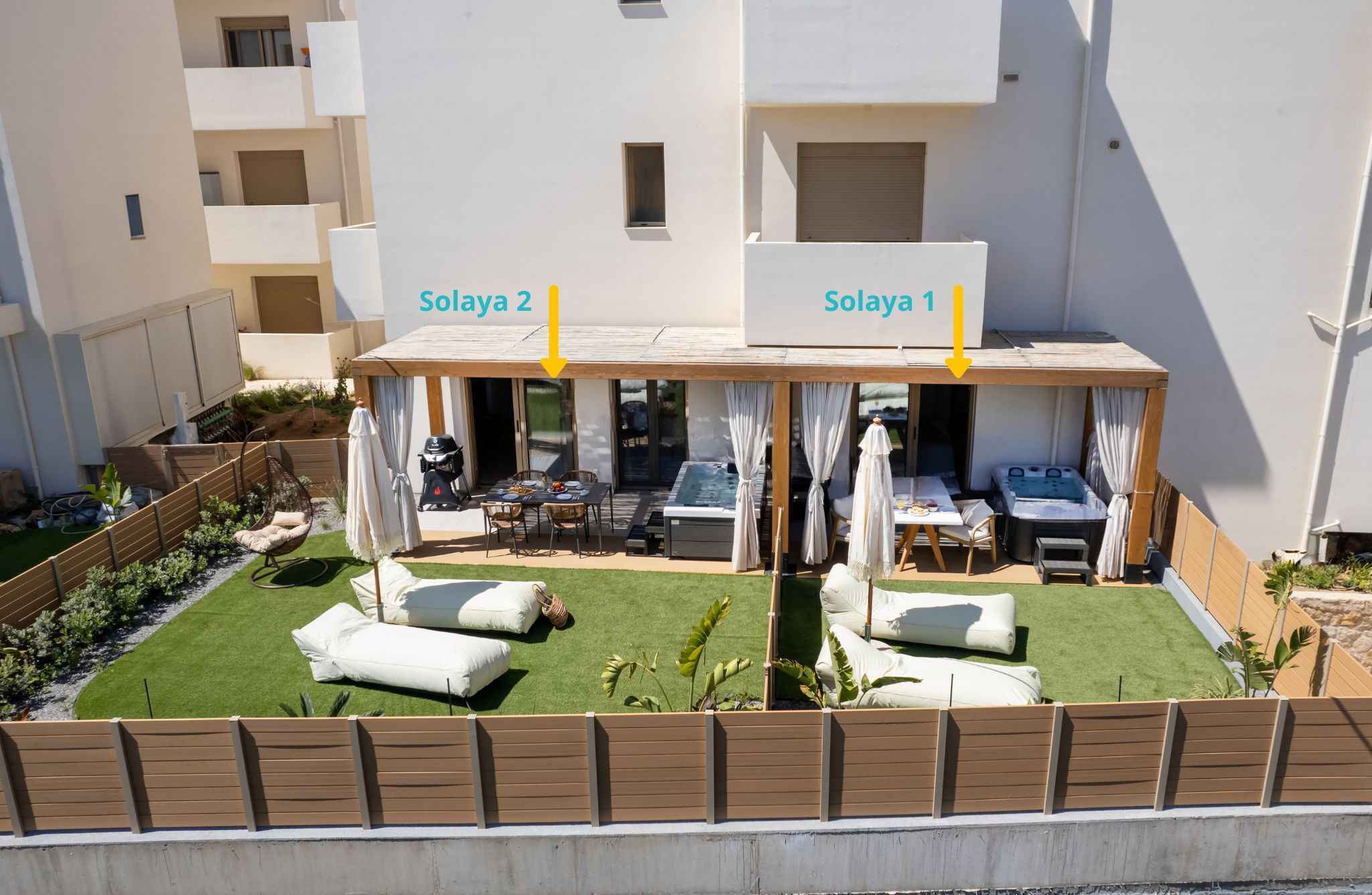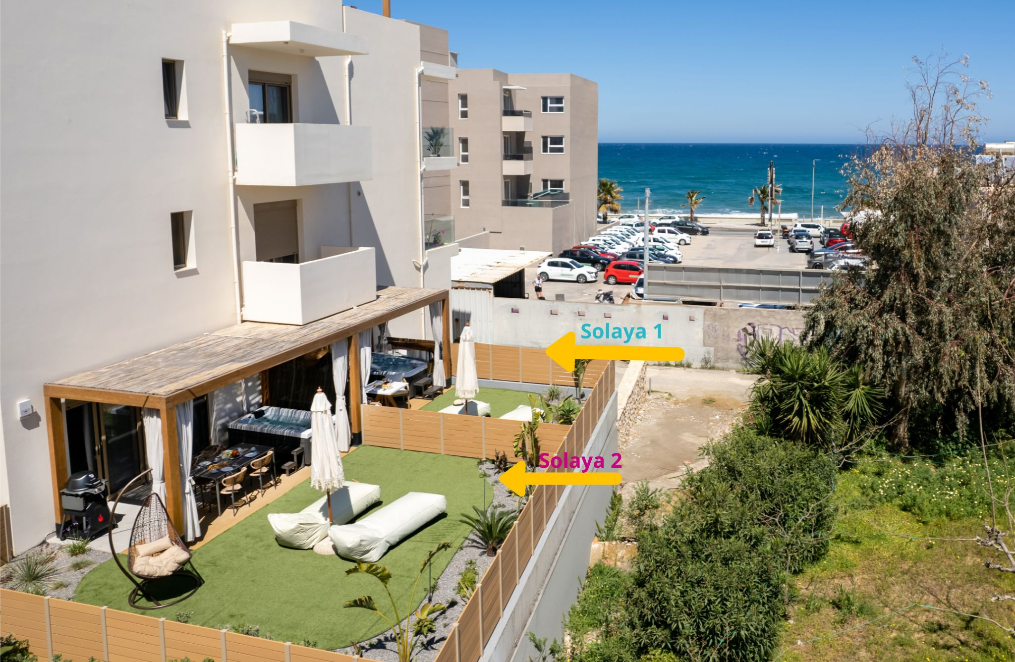 Guests have exclusive access to both suites (120 sqm total), their respective private outdoor areas, and two dedicated parking spaces. No facilities are shared with third parties.