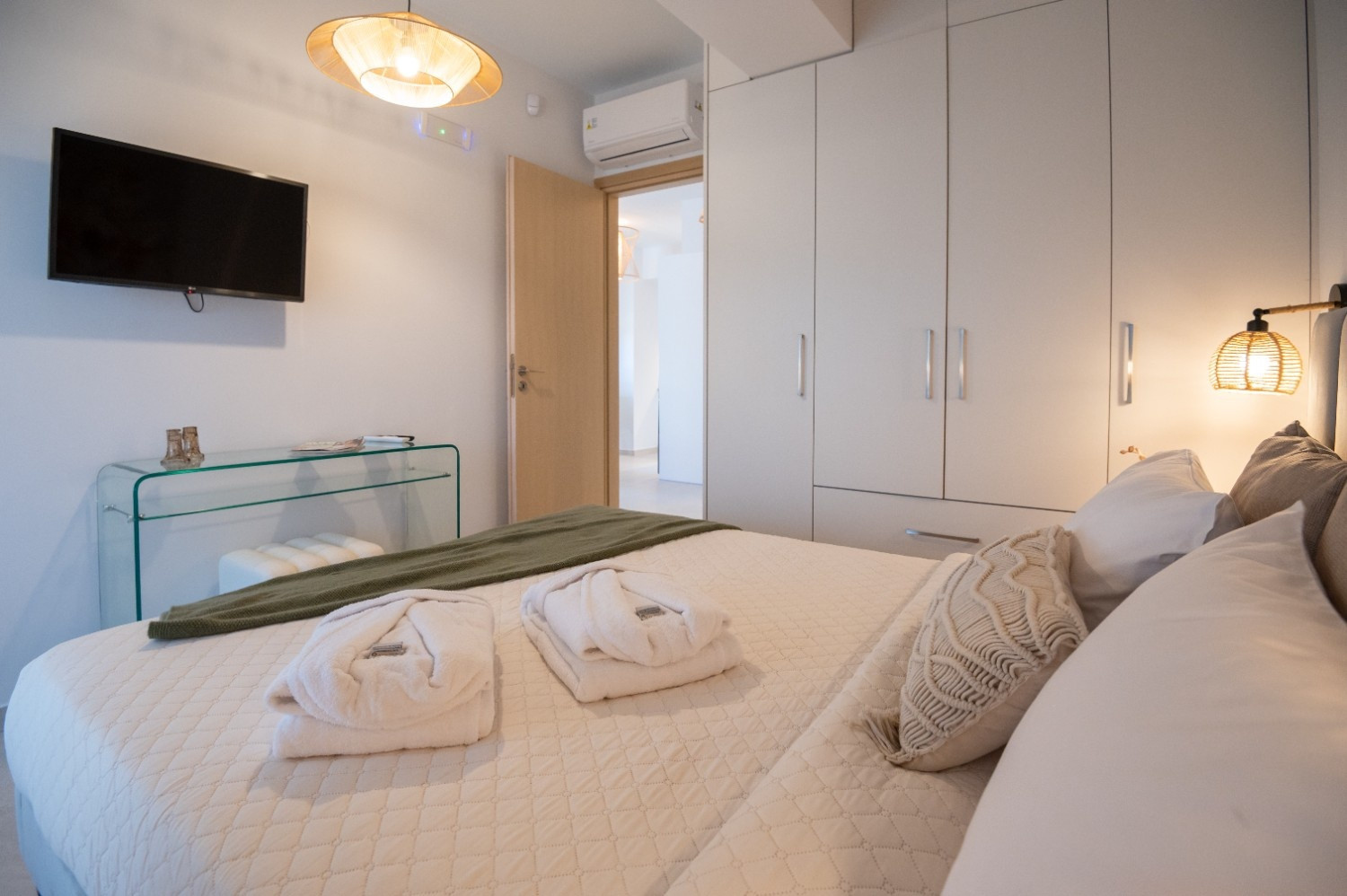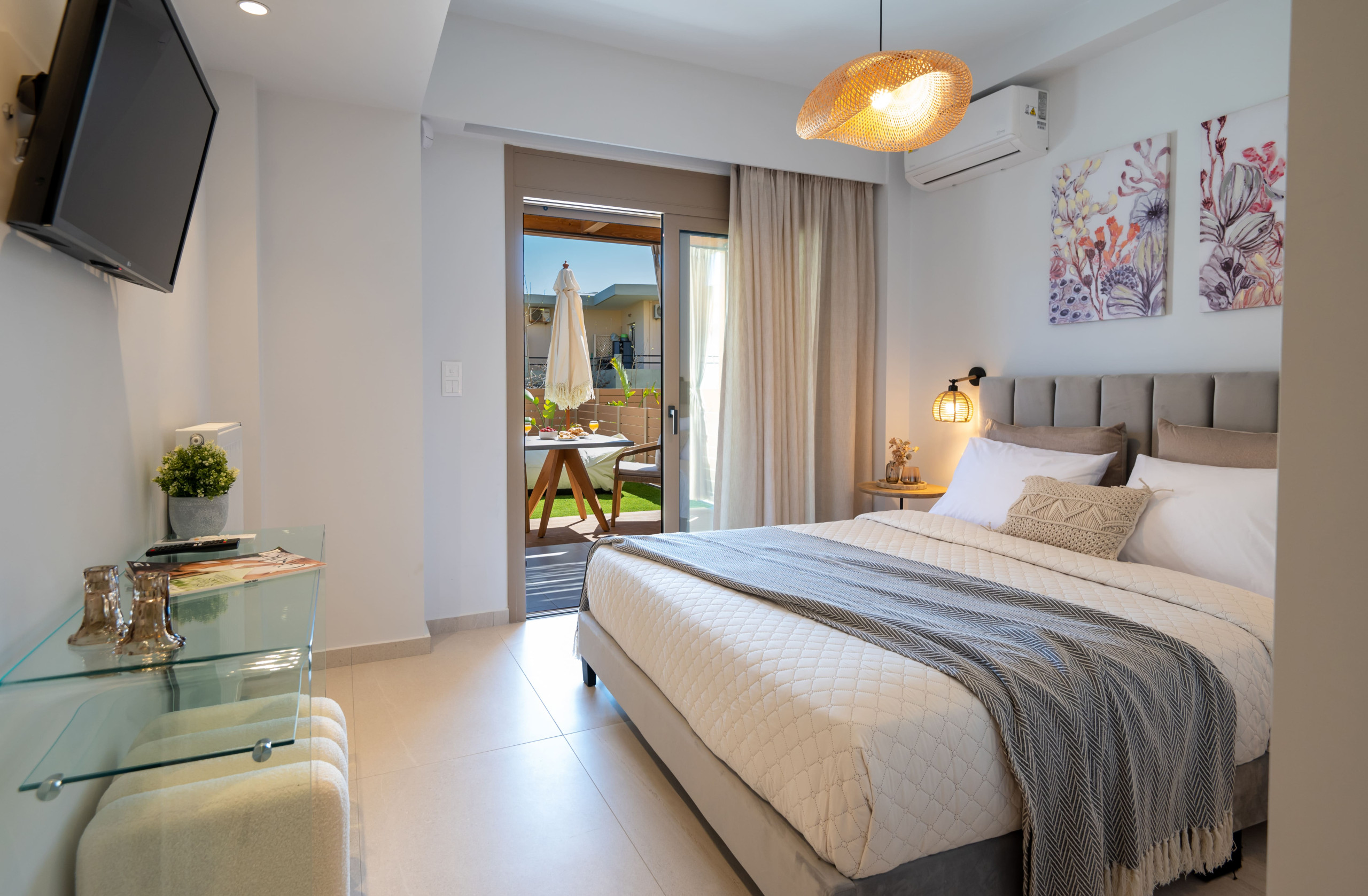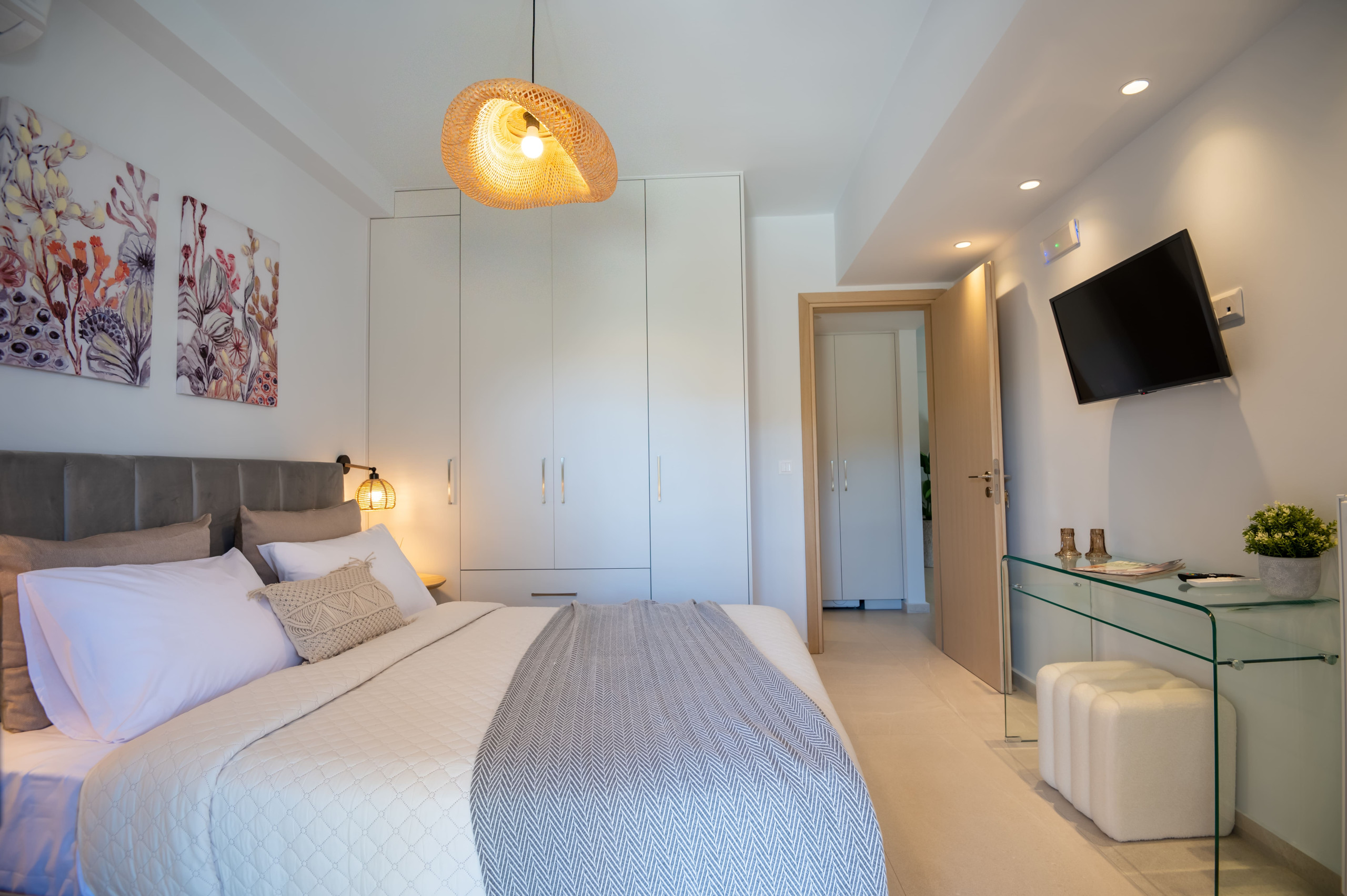 Bedroom: Double bed with woven lighting and premium linens.