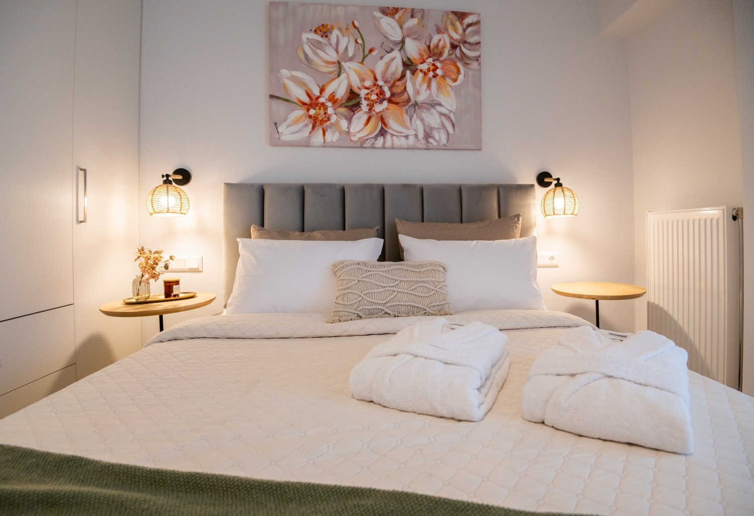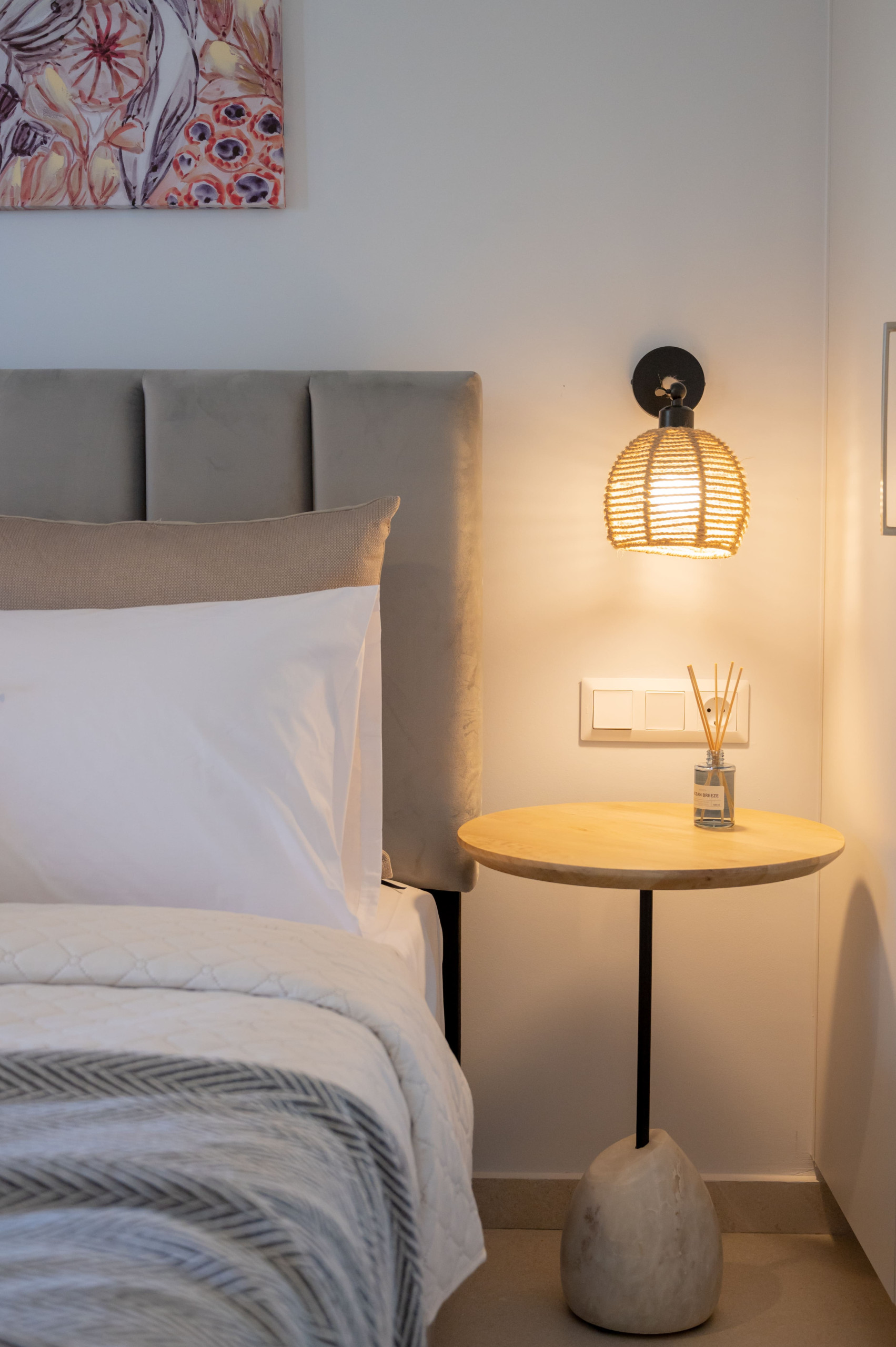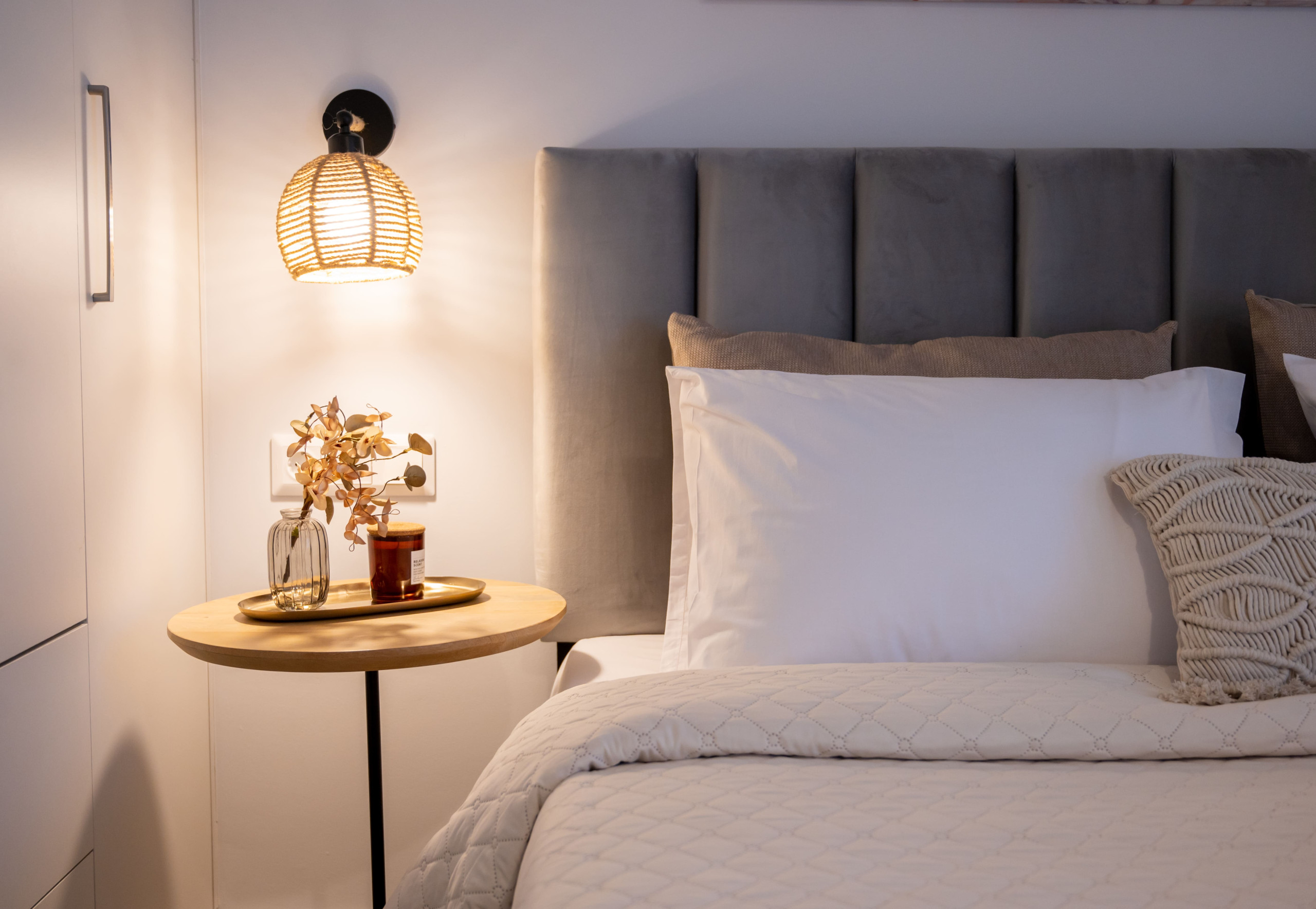 Bedroom: Double bed with woven lighting and premium linens.