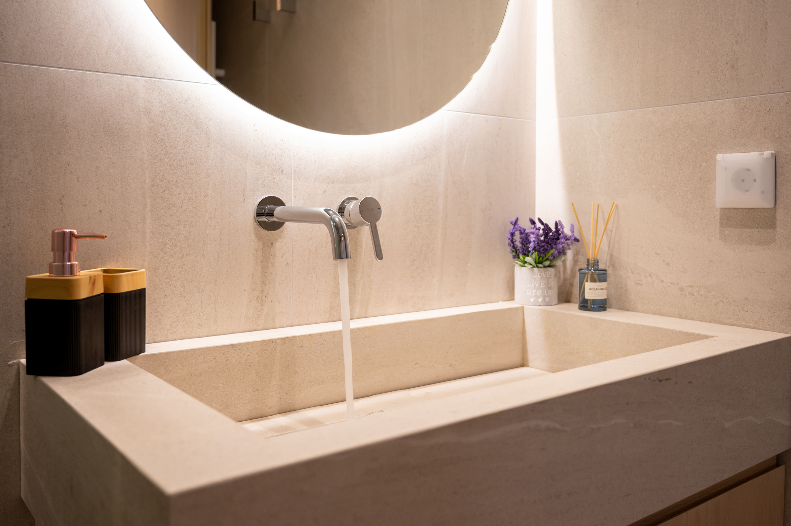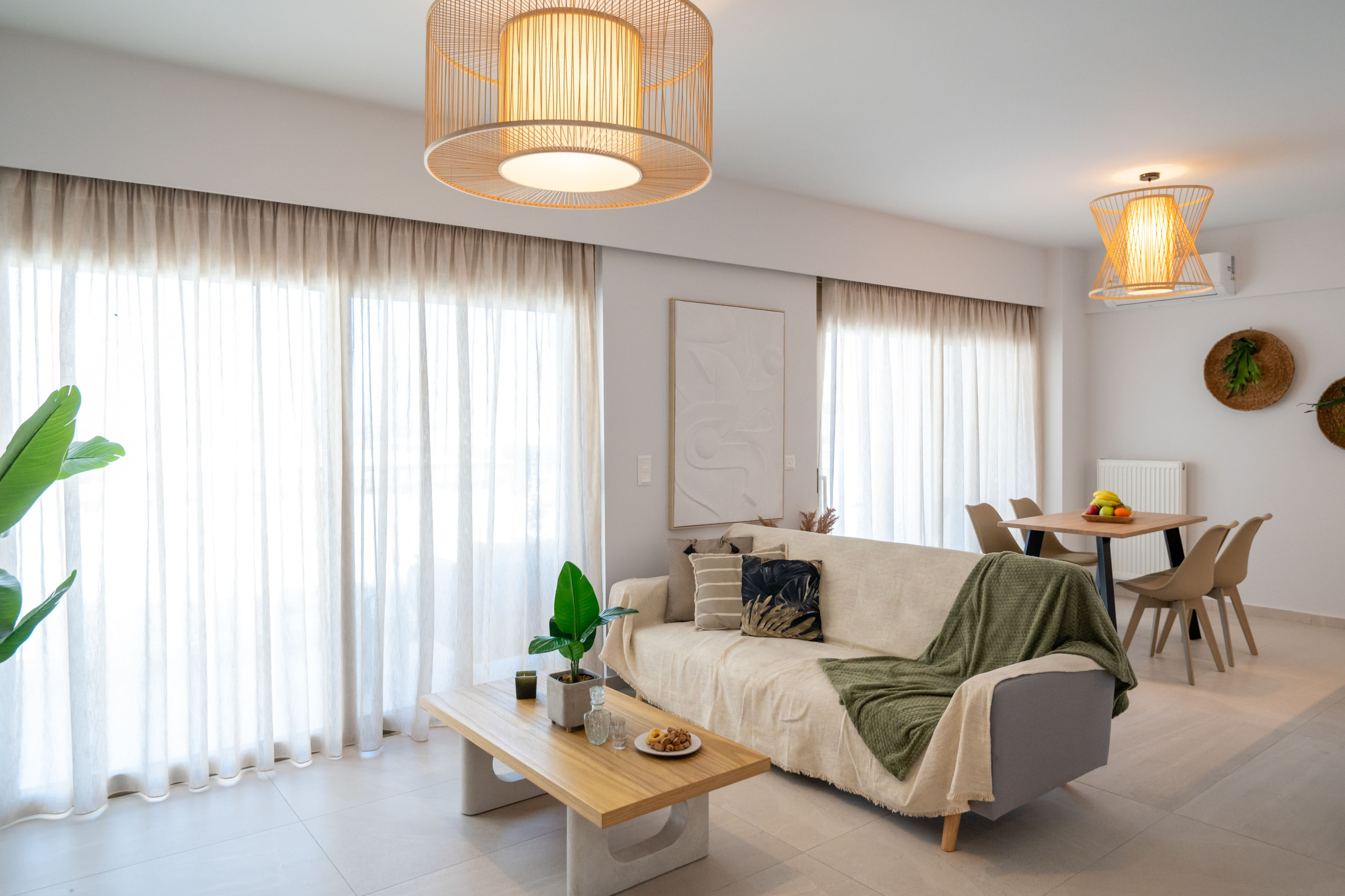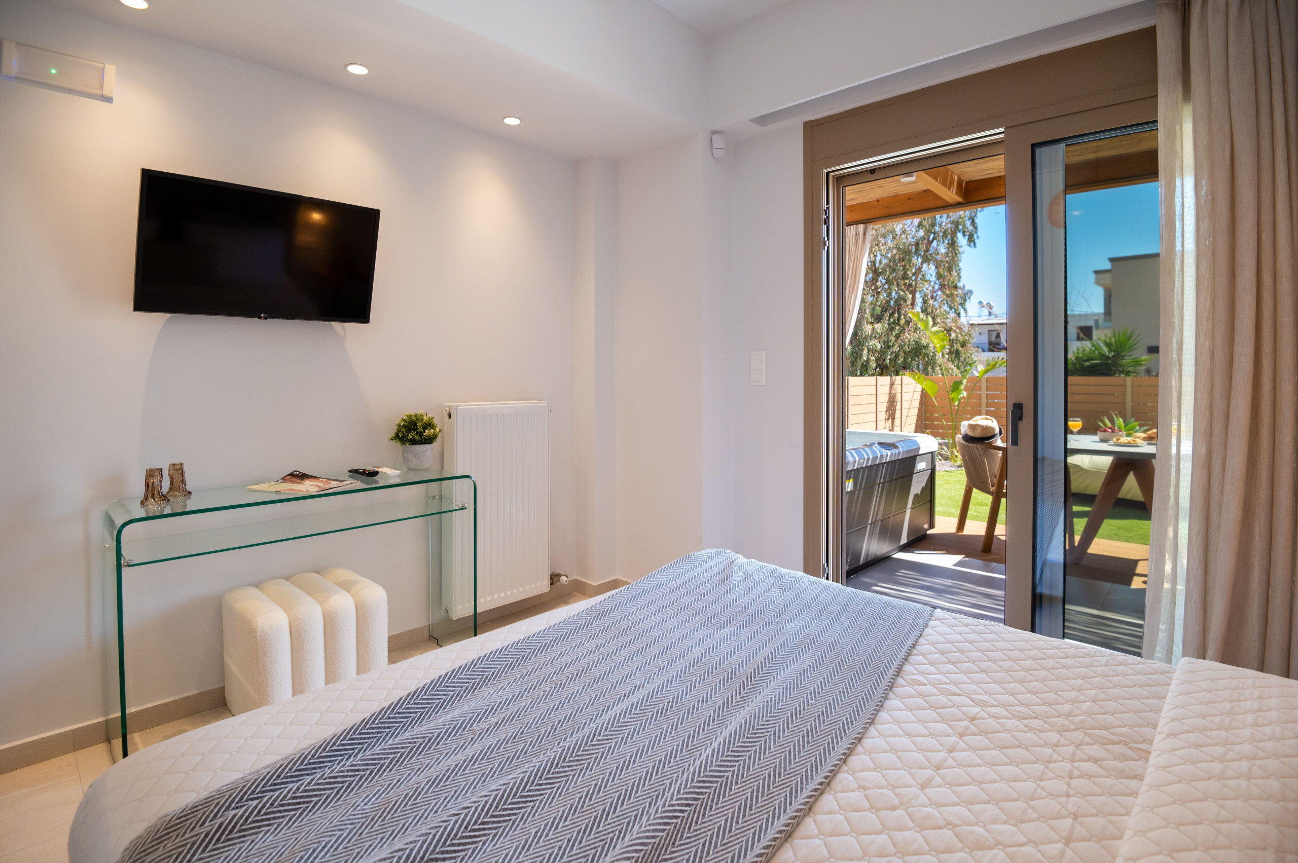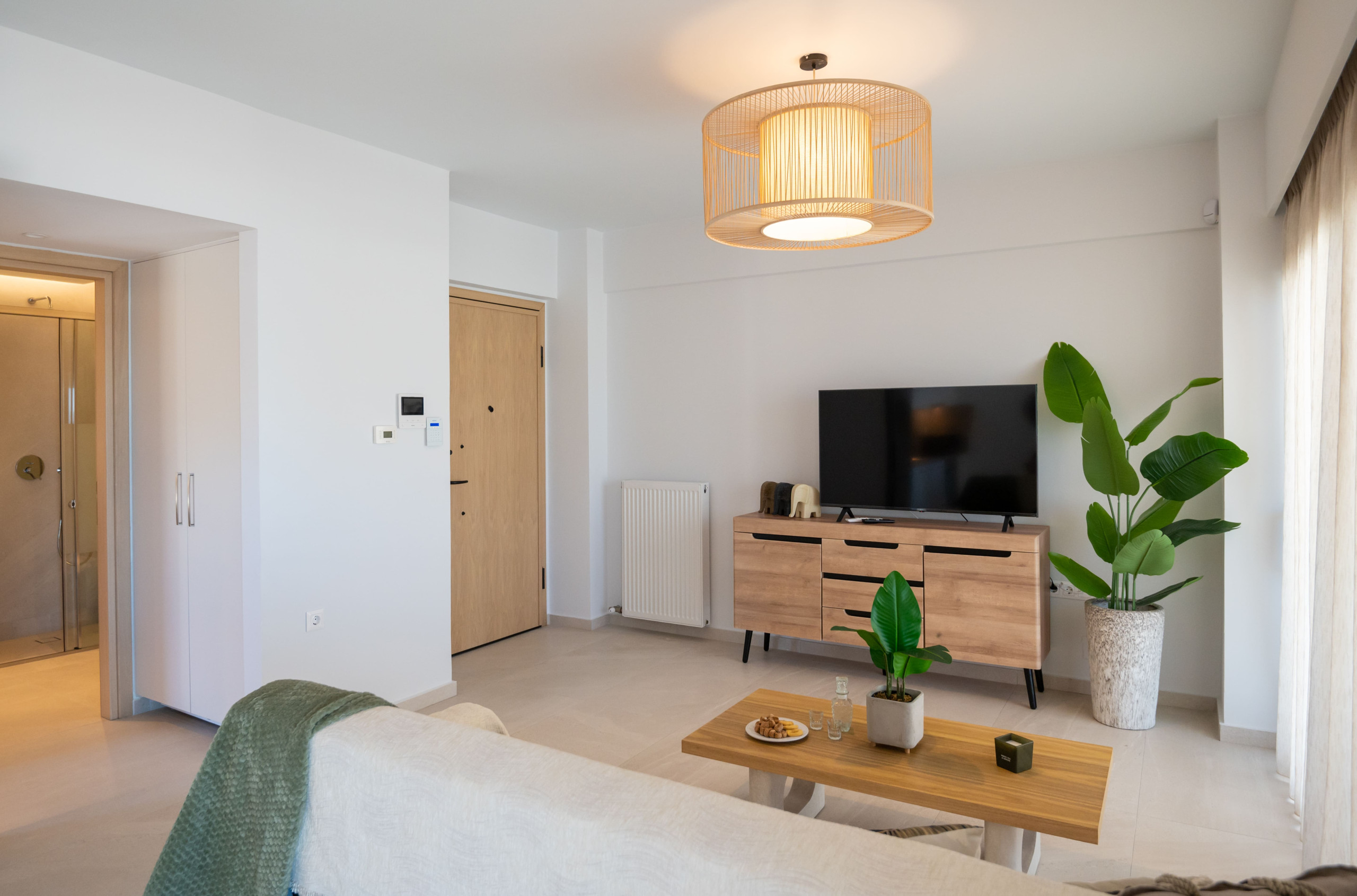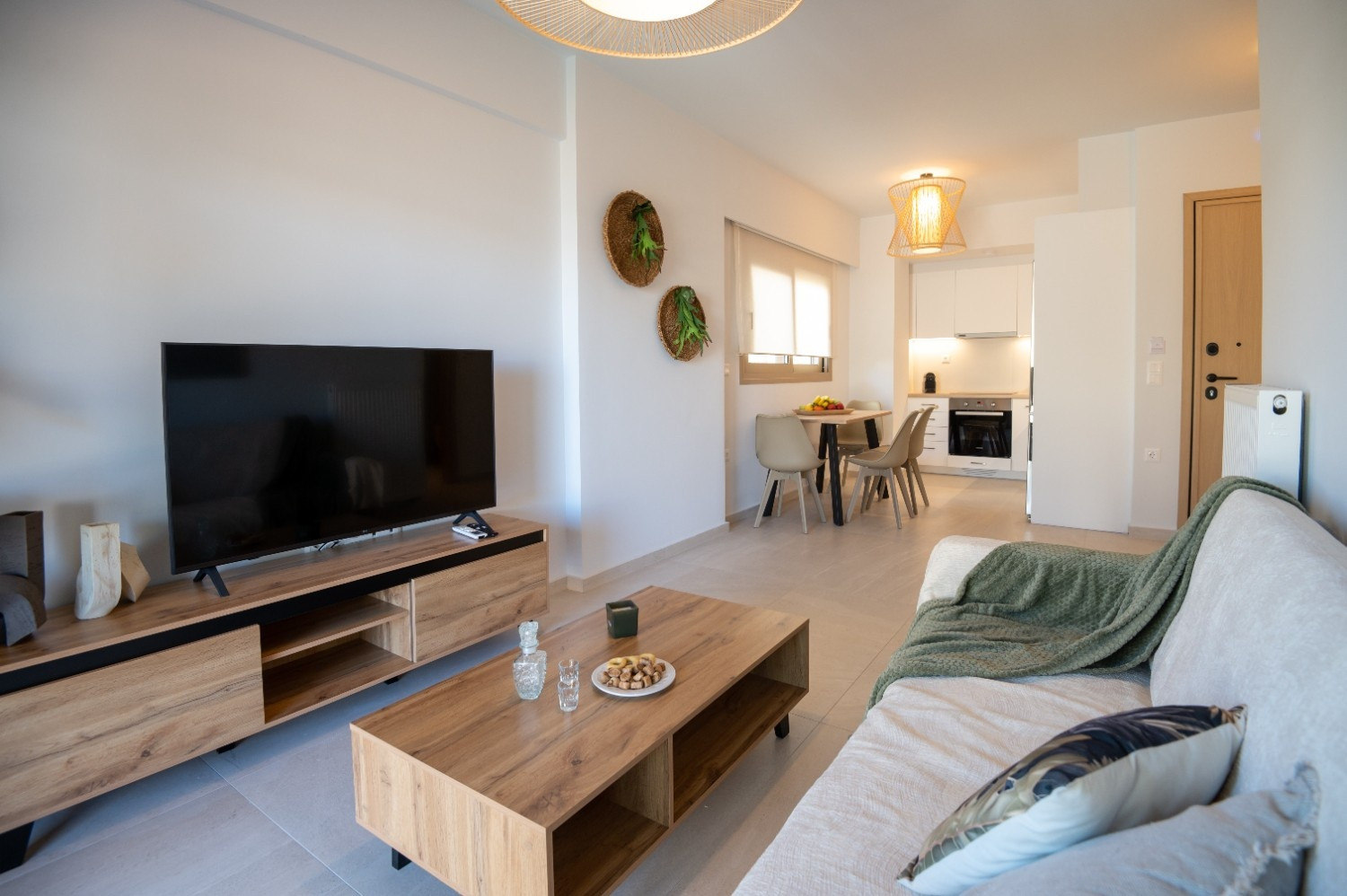 Living Area: Design-led sitting zone with Smart TV and coastal textures.