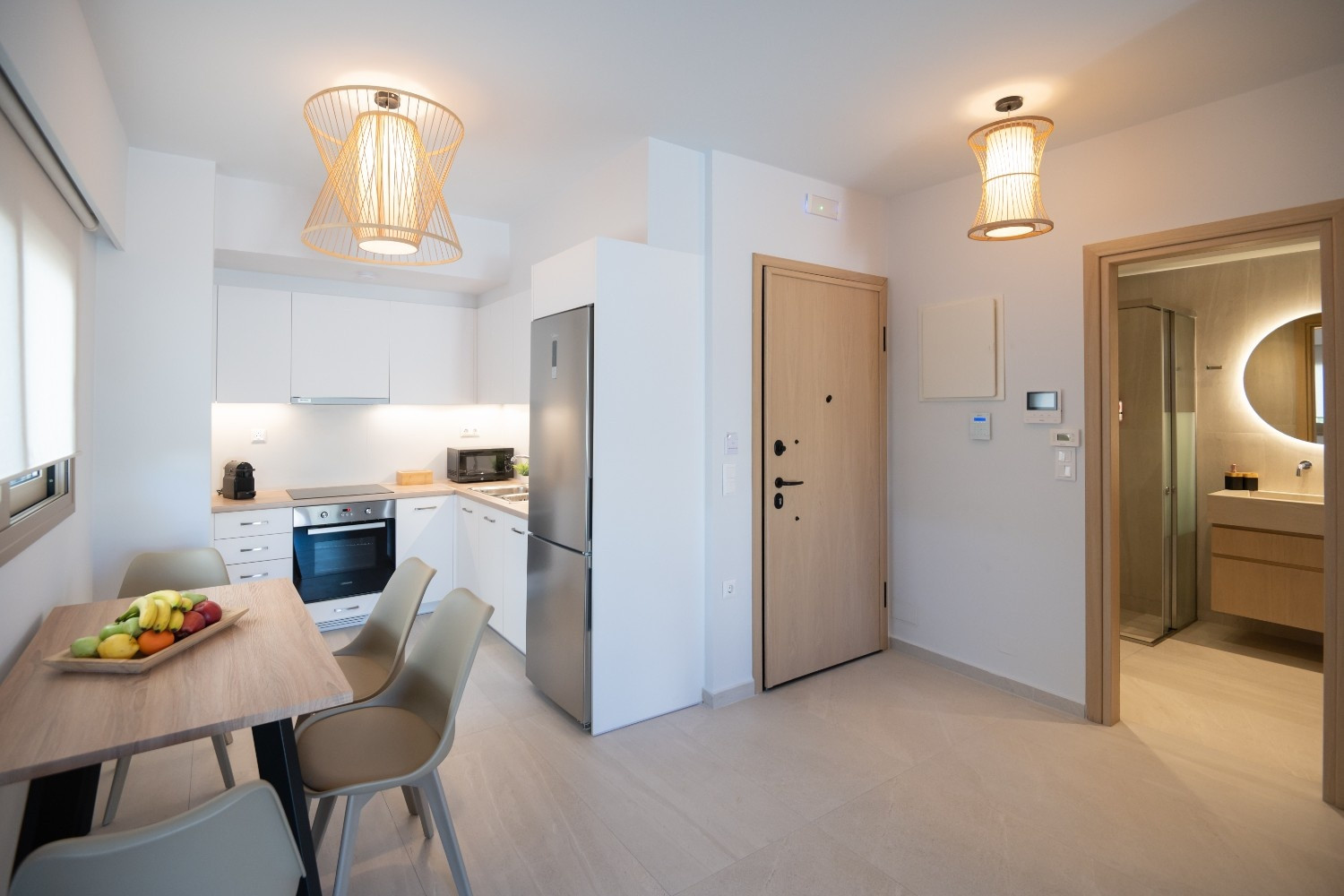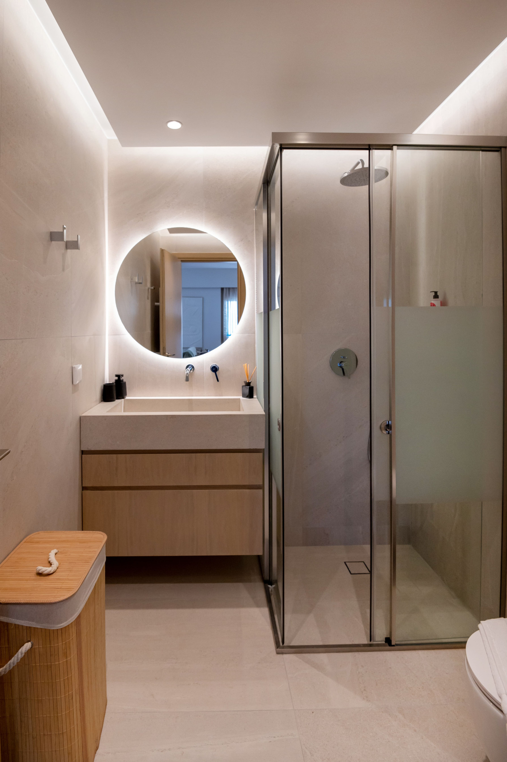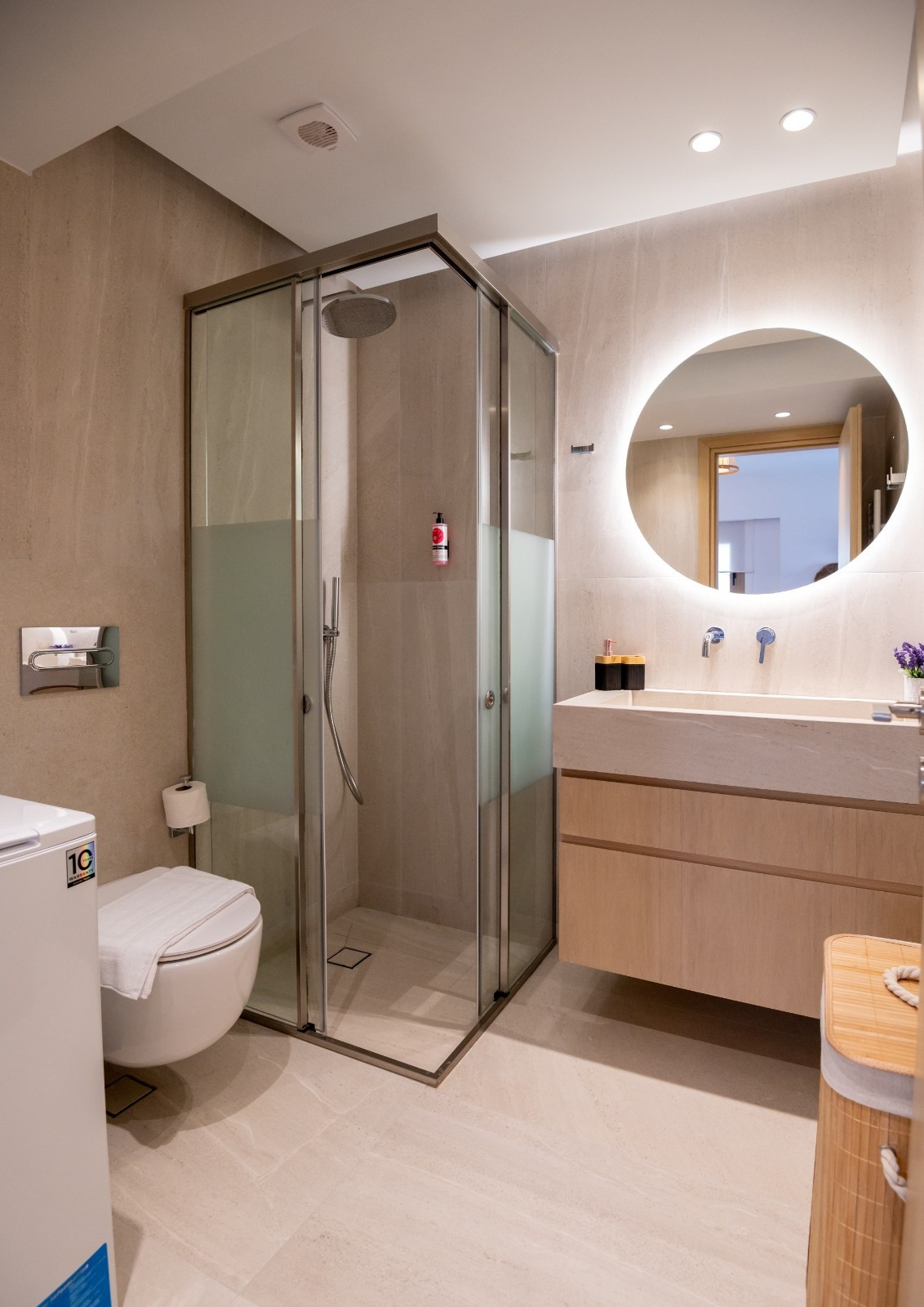 Bathroom: Walk-in shower, LED vanity, and in-suite washing machine.