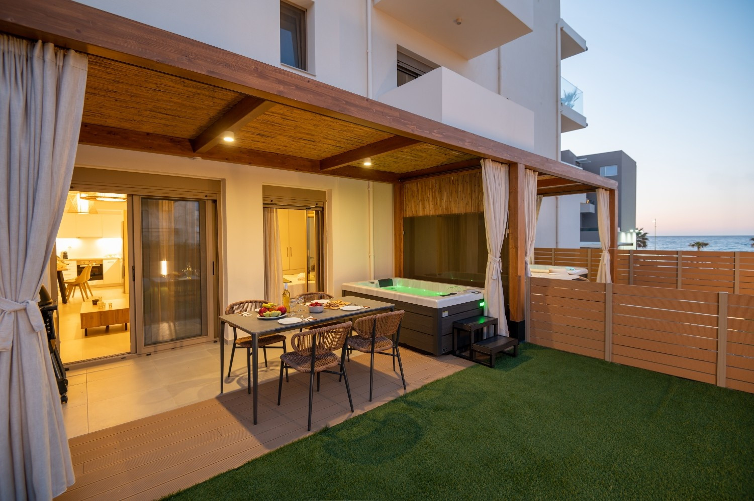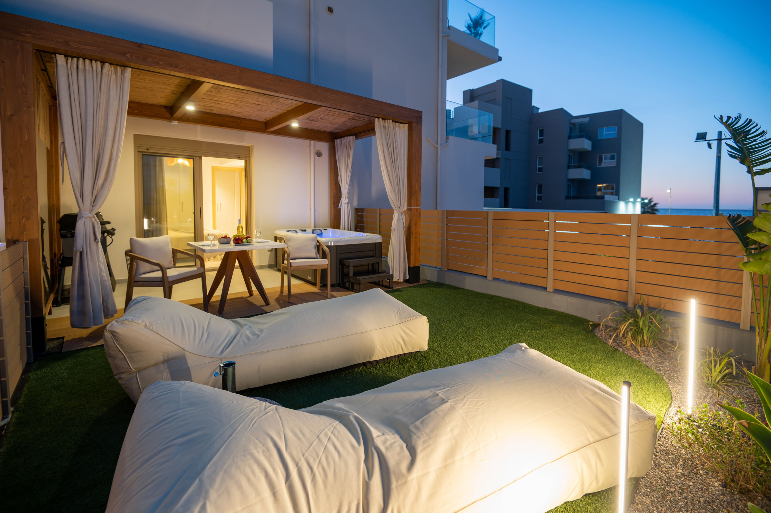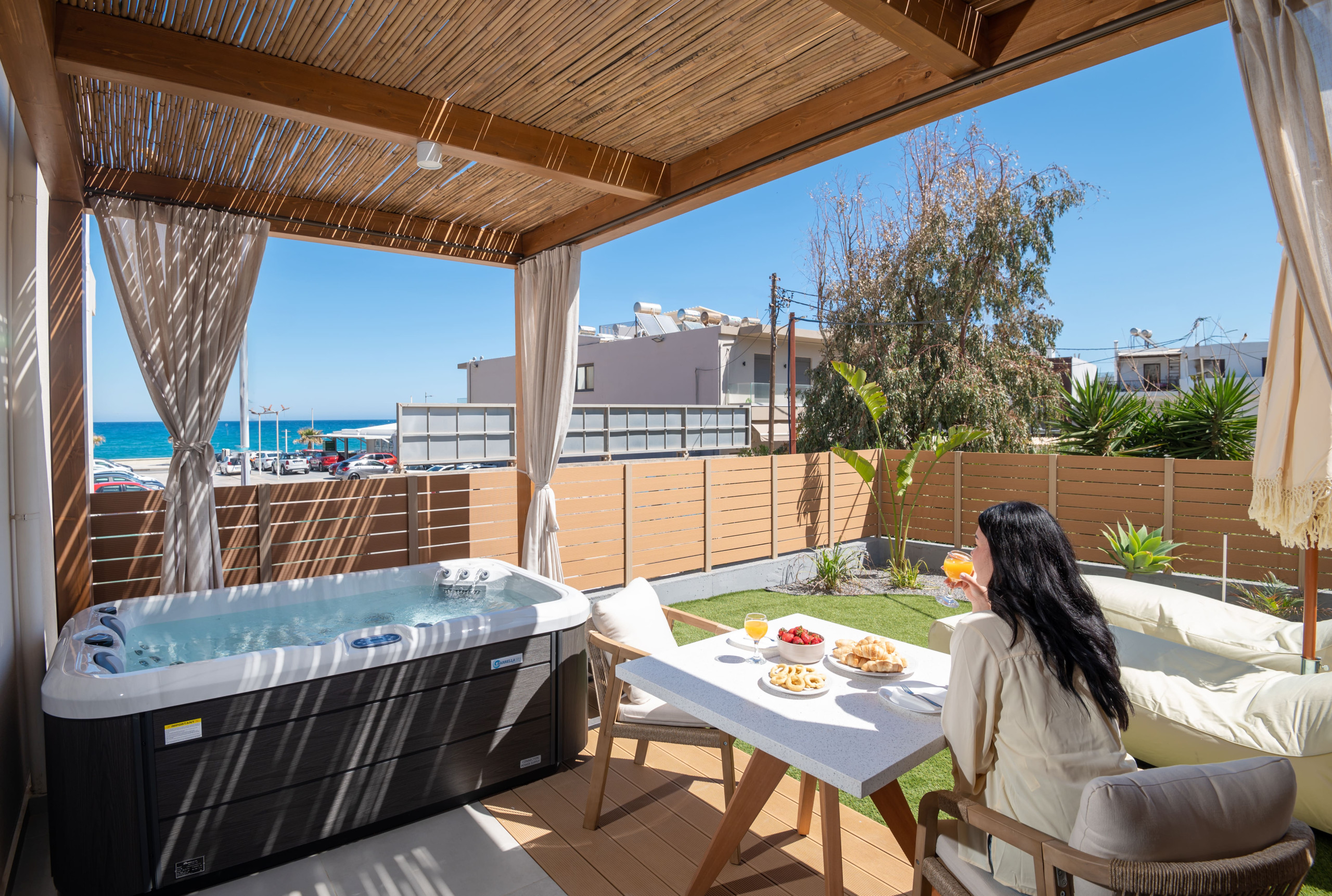 Curated for families or groups of 4-6, this dual-listing combines two adjacent, design-led suites—Solaya I and Solaya II—into one seamless 120 sqm sanctuary. Located 50 meters from Rethymno Beach, these neighboring retreats offer the perfect balance of communal group time and independent privacy. The property features two private heated hot tubs, two fully equipped kitchens, and two dedicated parking spaces within the city limits.