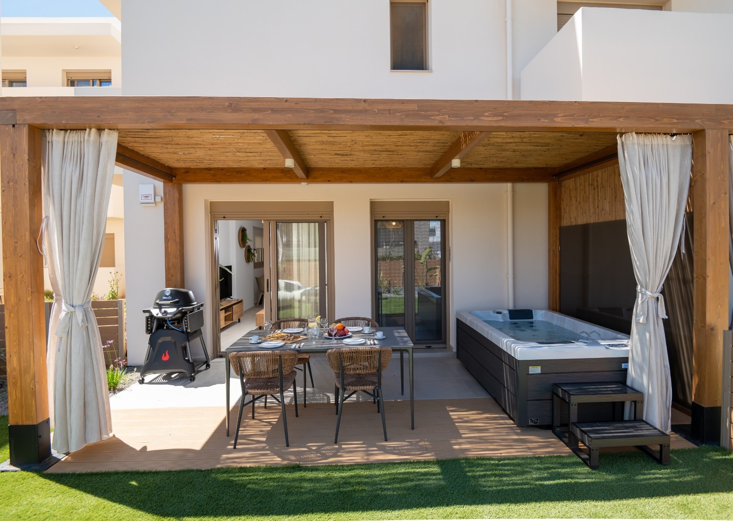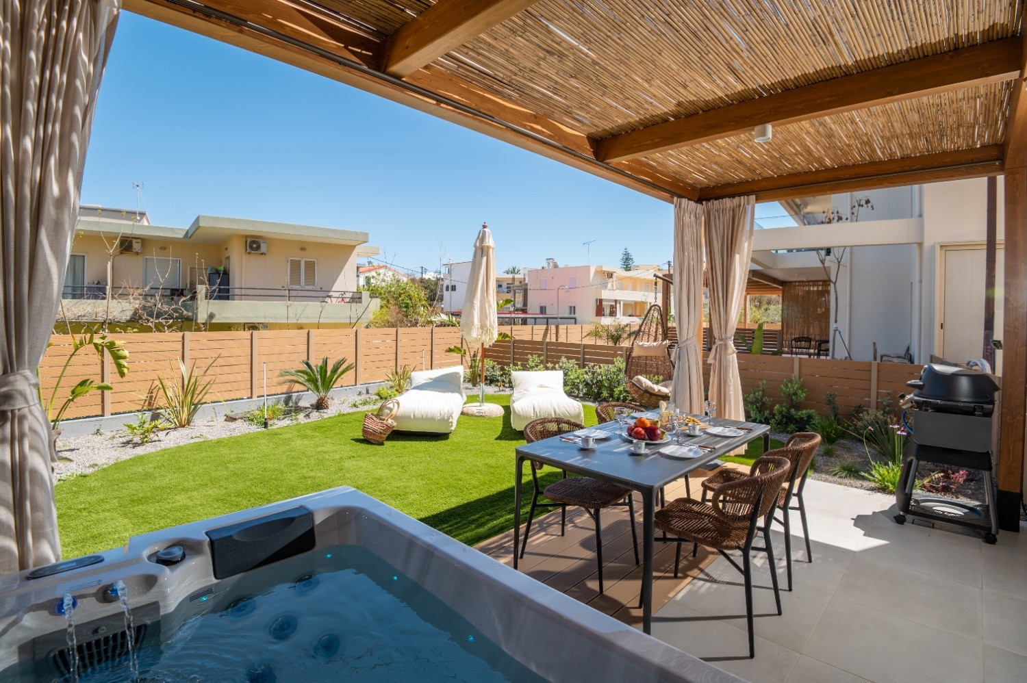 Outdoor: Shaded patio with a freestanding heated hot tub and gas BBQ.