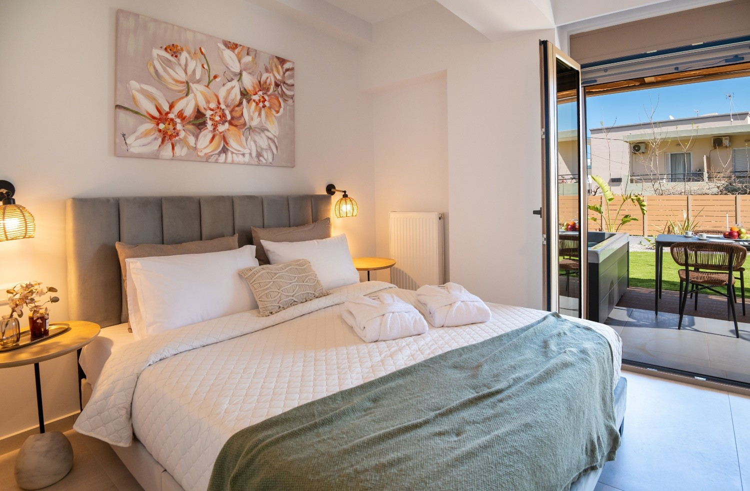 Bedroom: Double bed with upholstered headboard and premium linens.