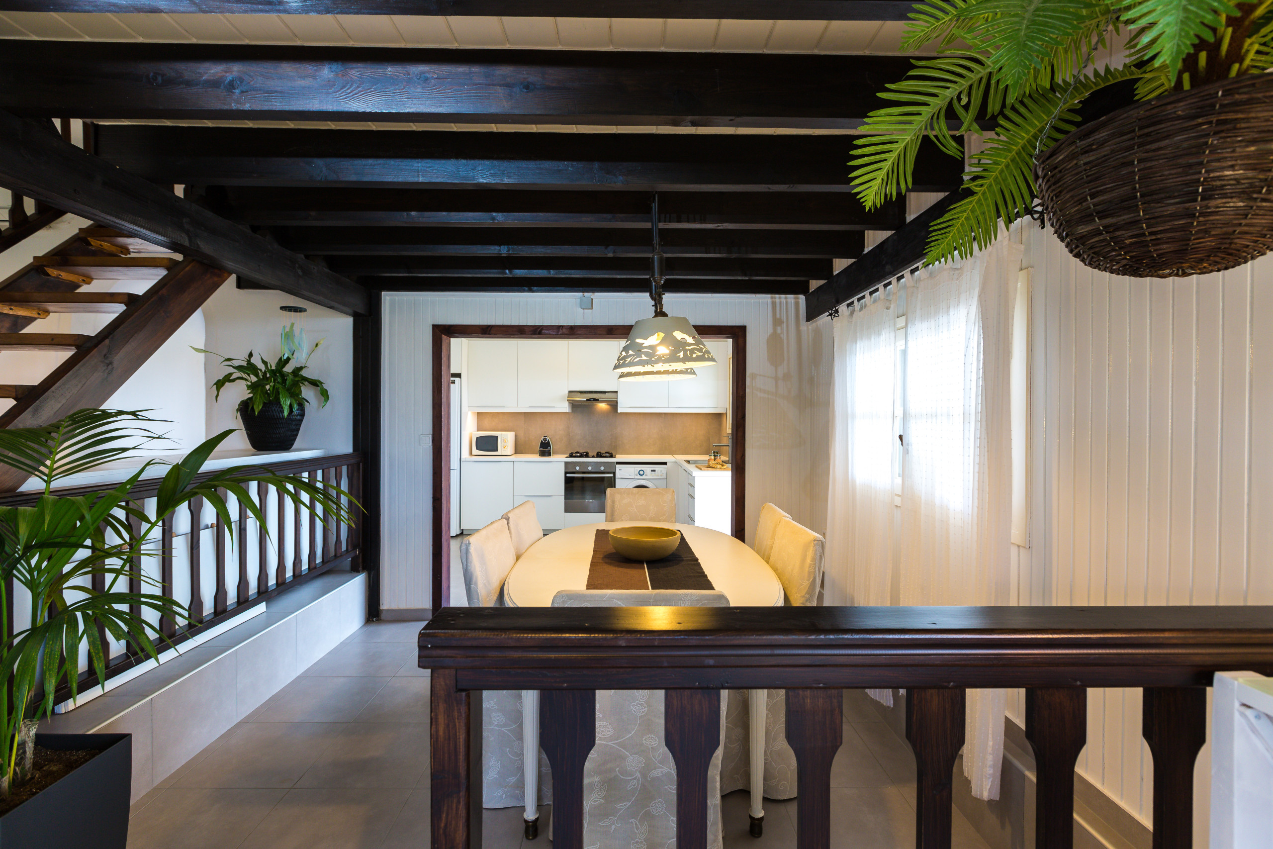 The main living areas are characterized by abundant natural light and a seamless connection to the outdoors. The layout includes a comfortable living room and a fully equipped kitchen tailored for home cooking. The architectural design naturally separates the main living quarters from the pool level, ensuring practical functional zones for large groups.
