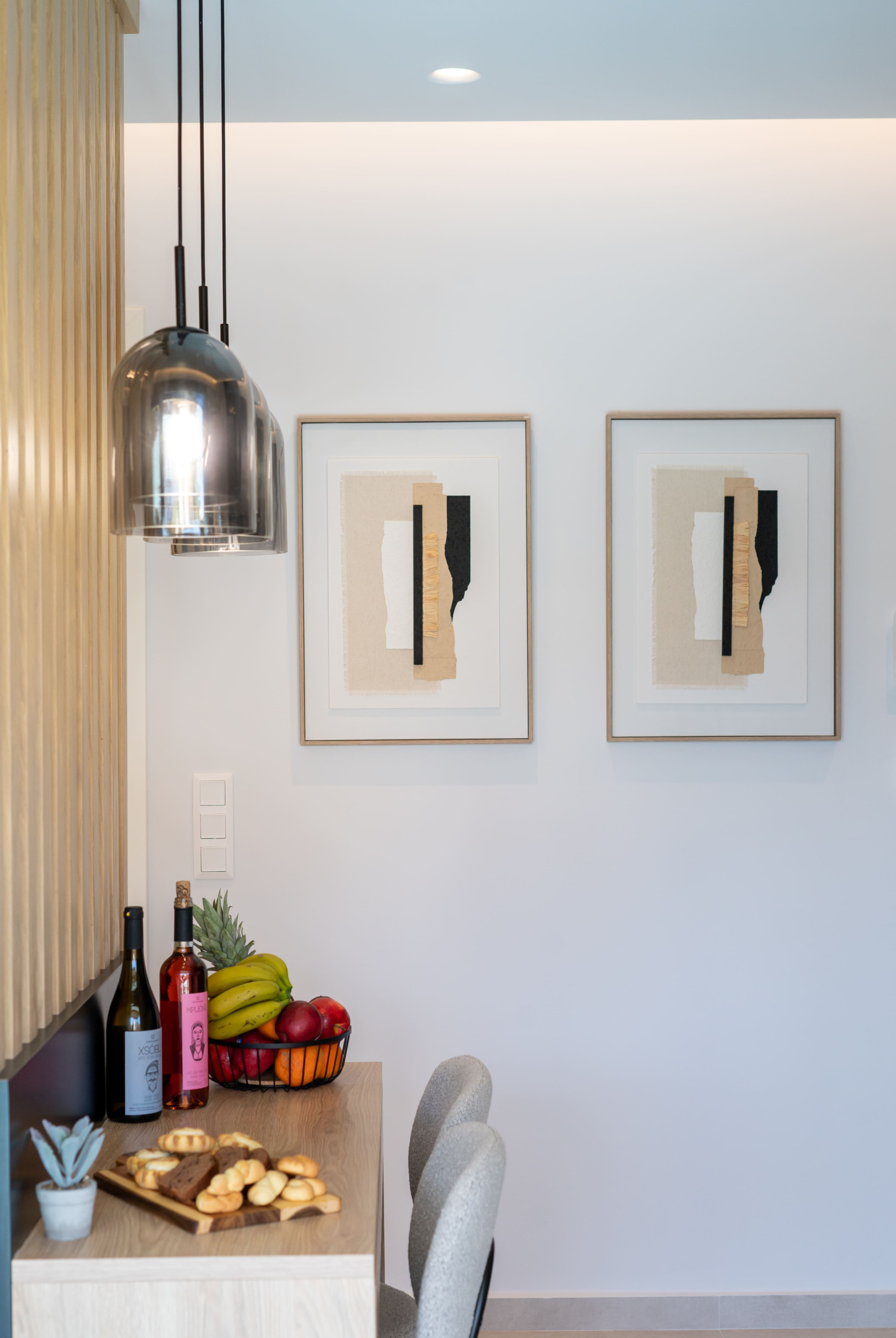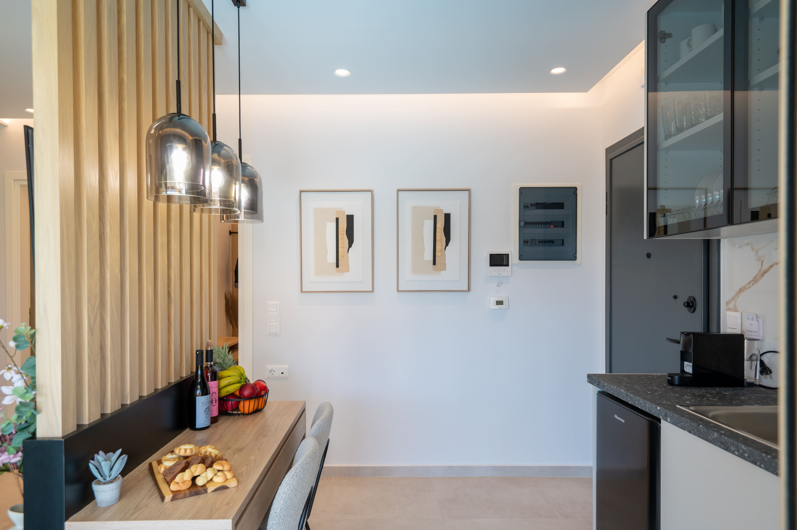 The interior focuses on elemental simplicity and high-end materiality, integrating coastal tones and custom wooden architectural dividers. The living area connects a comfortable sitting zone, equipped with a Smart TV, directly to the premium kitchen via a dedicated dining counter. Clear architectural lines create a calm, uncluttered environment, allowing you to slow down and reconnect.