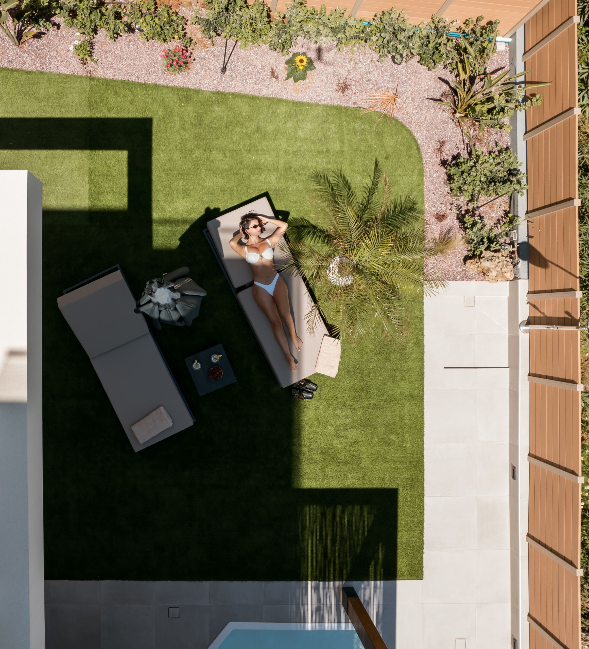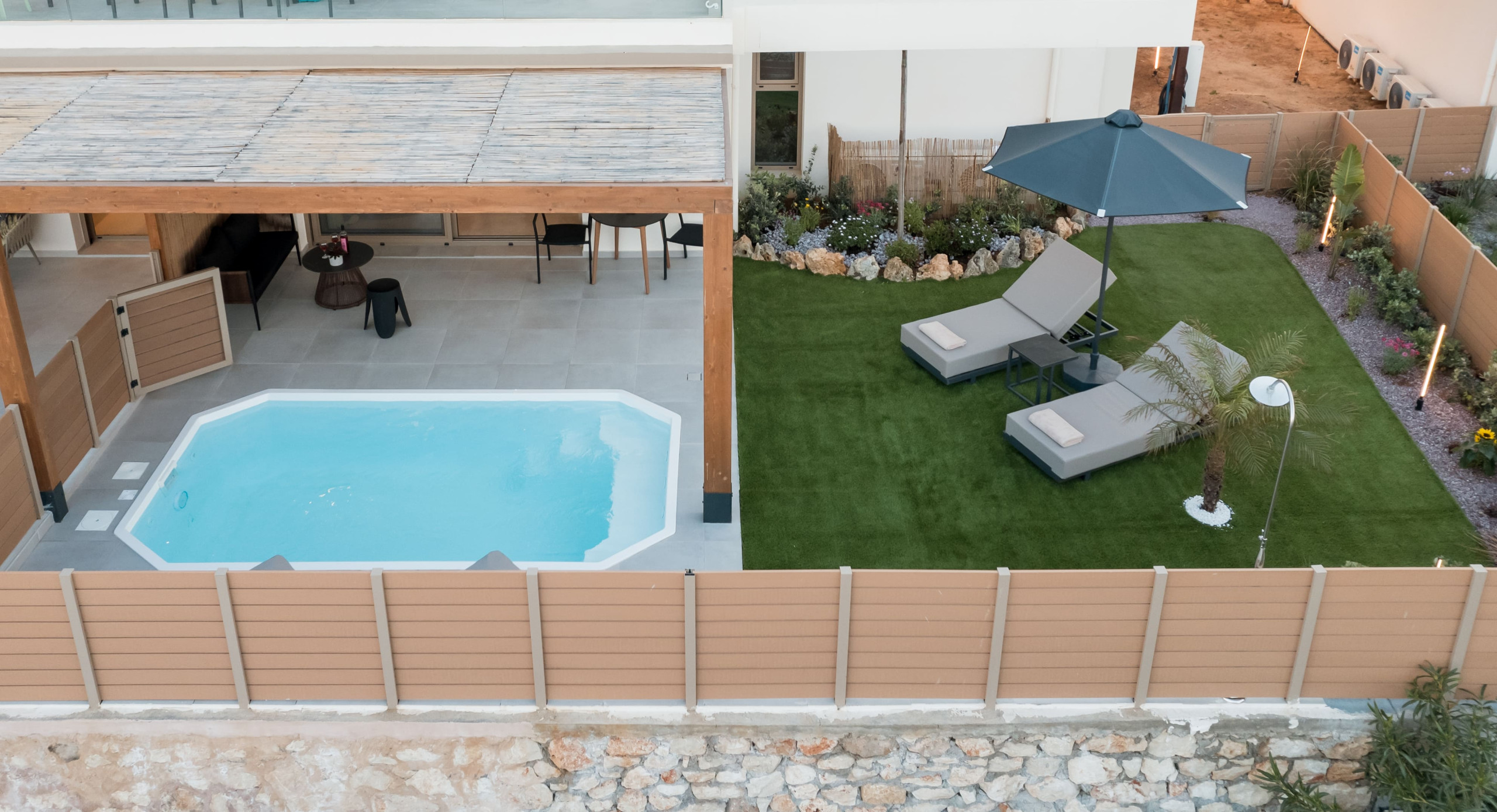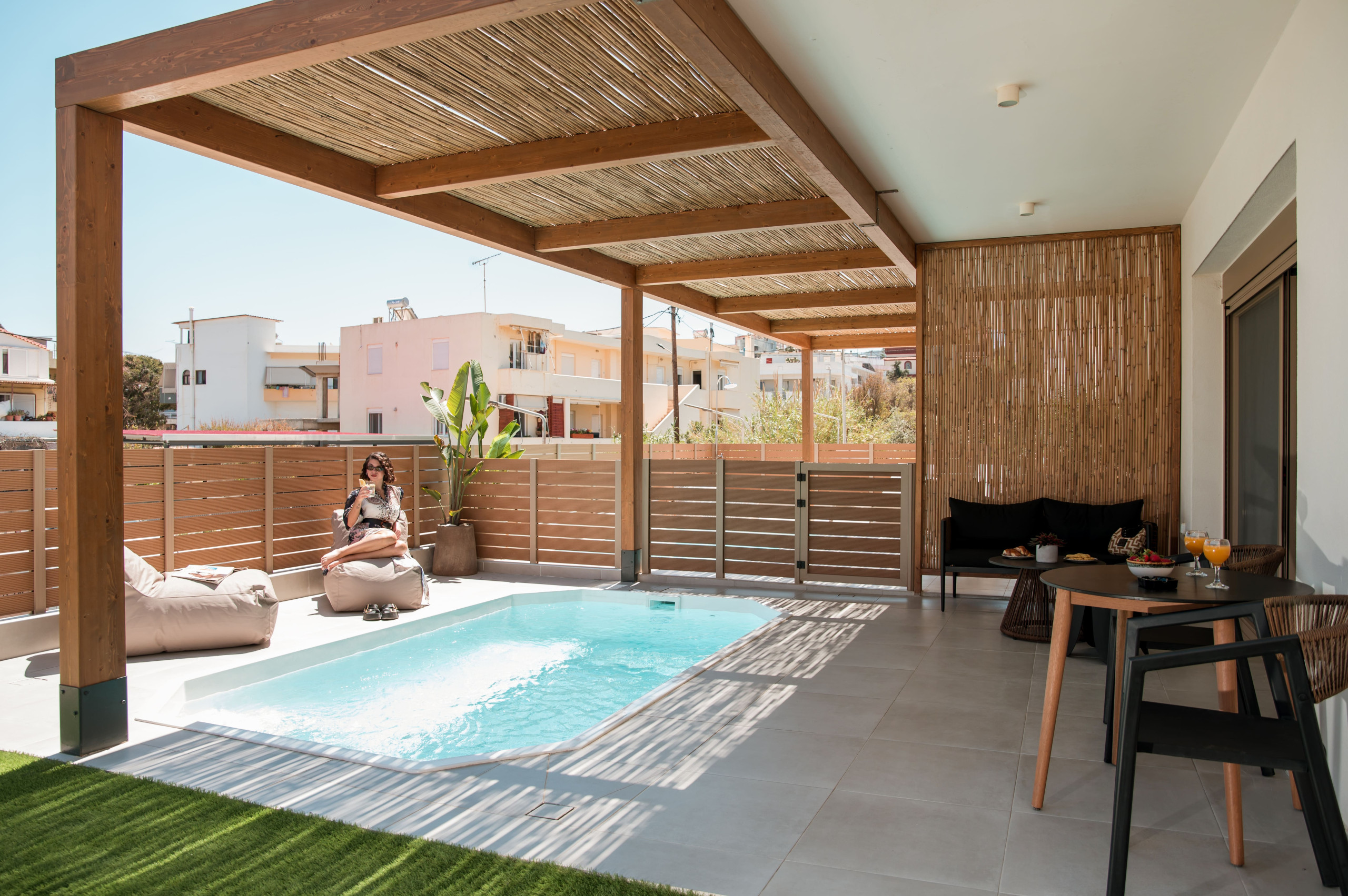 The private ground-floor exterior centers around a shaded wooden pergola, designed to extend the indoor living space seamlessly outdoors.