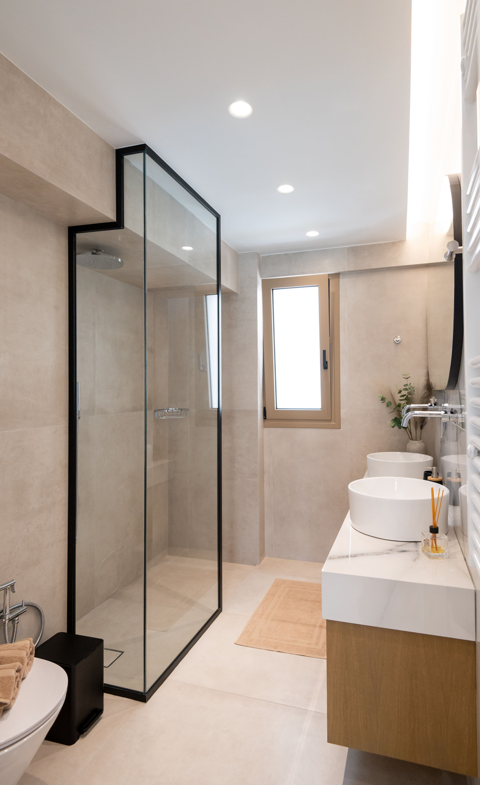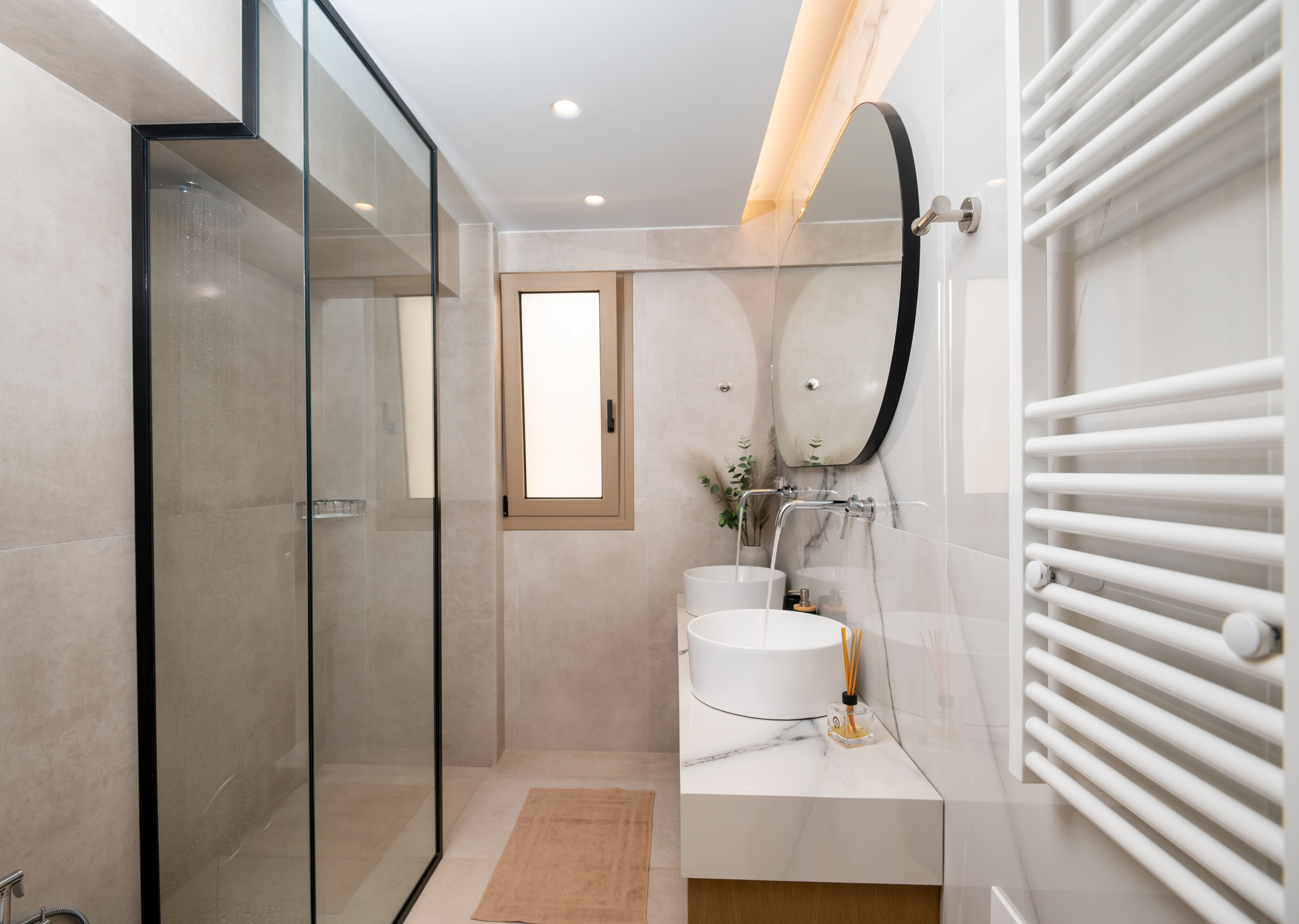 Bathroom: Contemporary design featuring a walk-in shower, high-end fixtures, and soft LED mirror lighting.