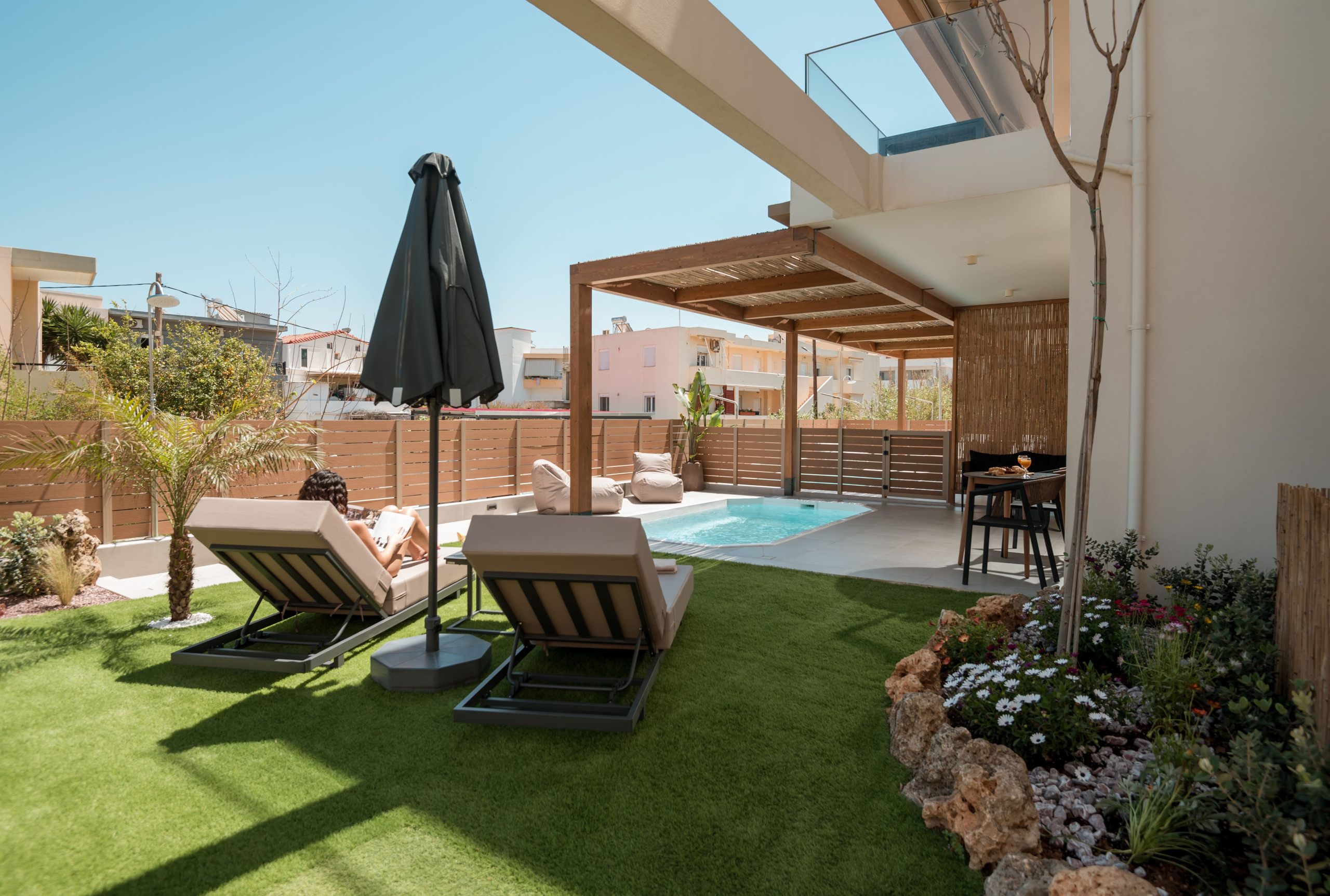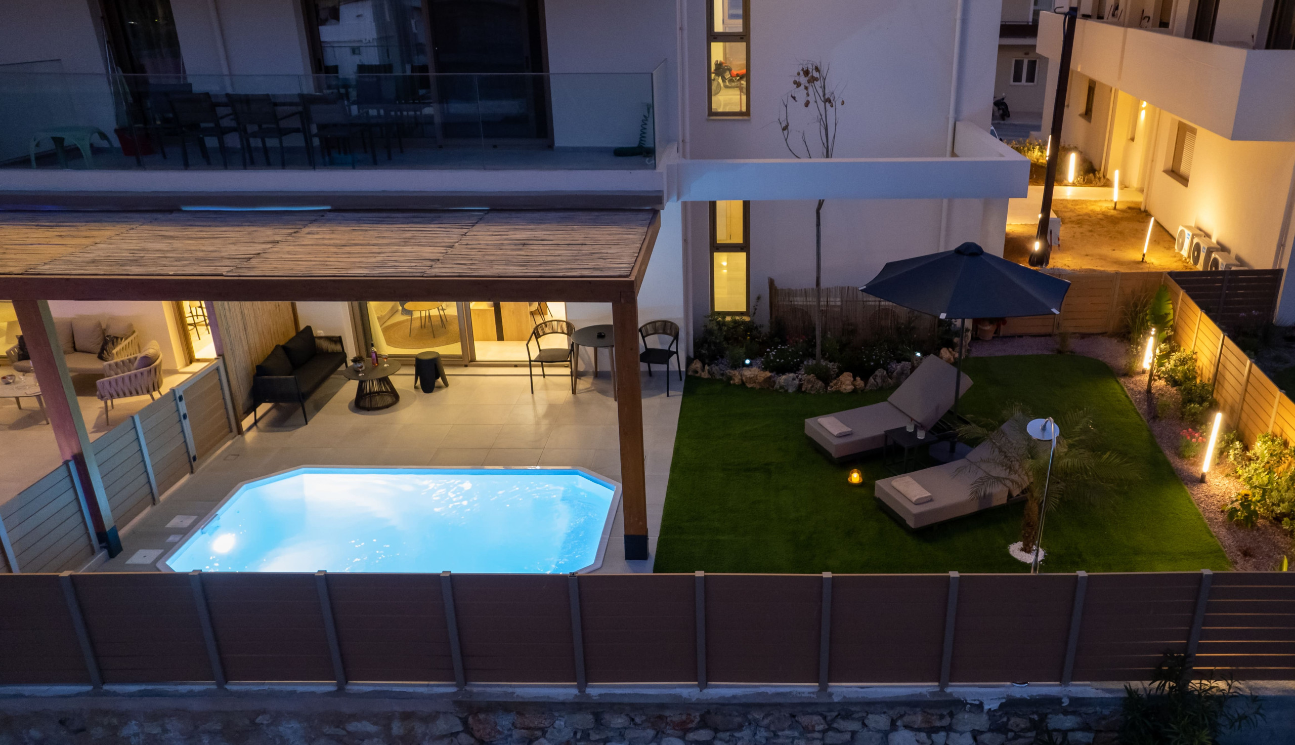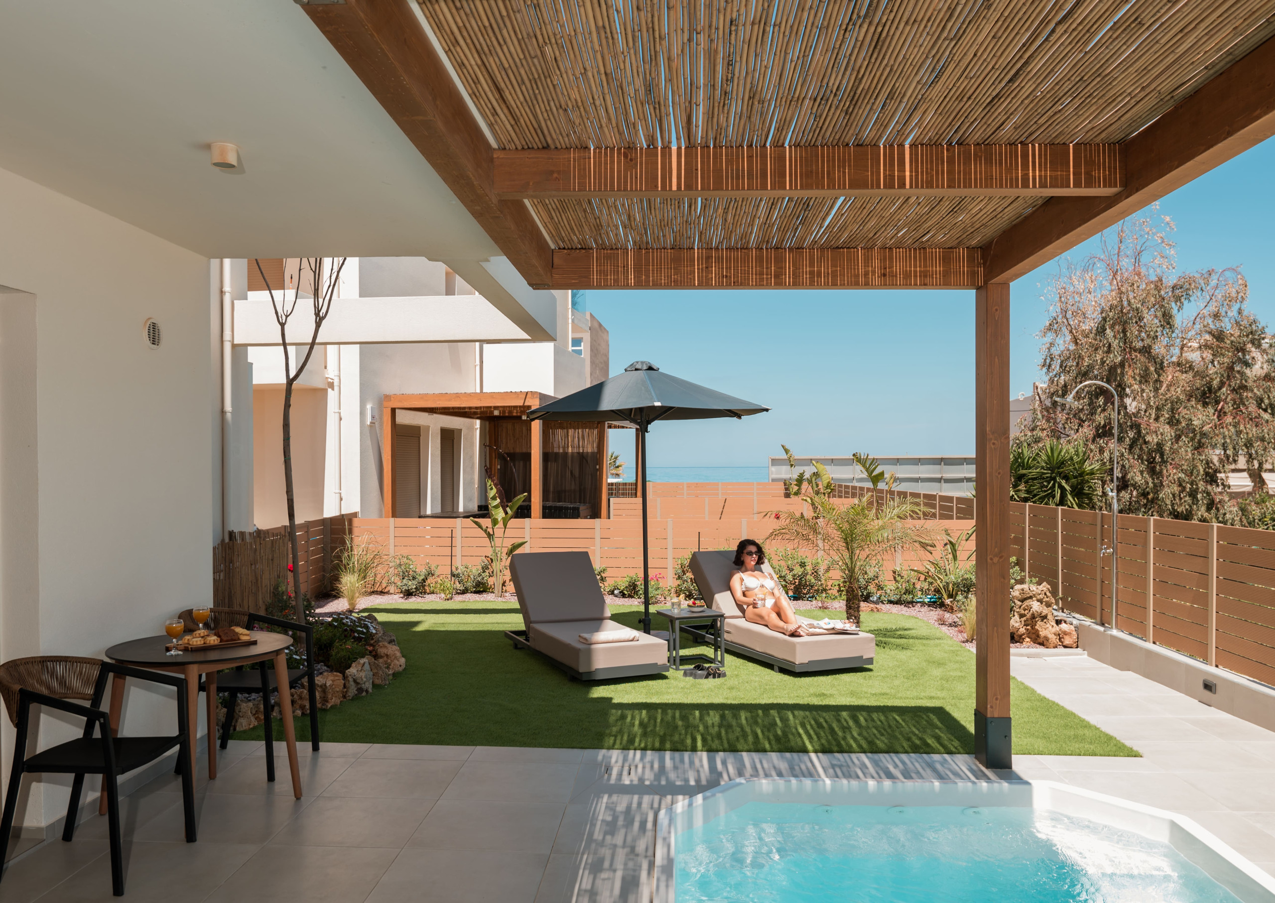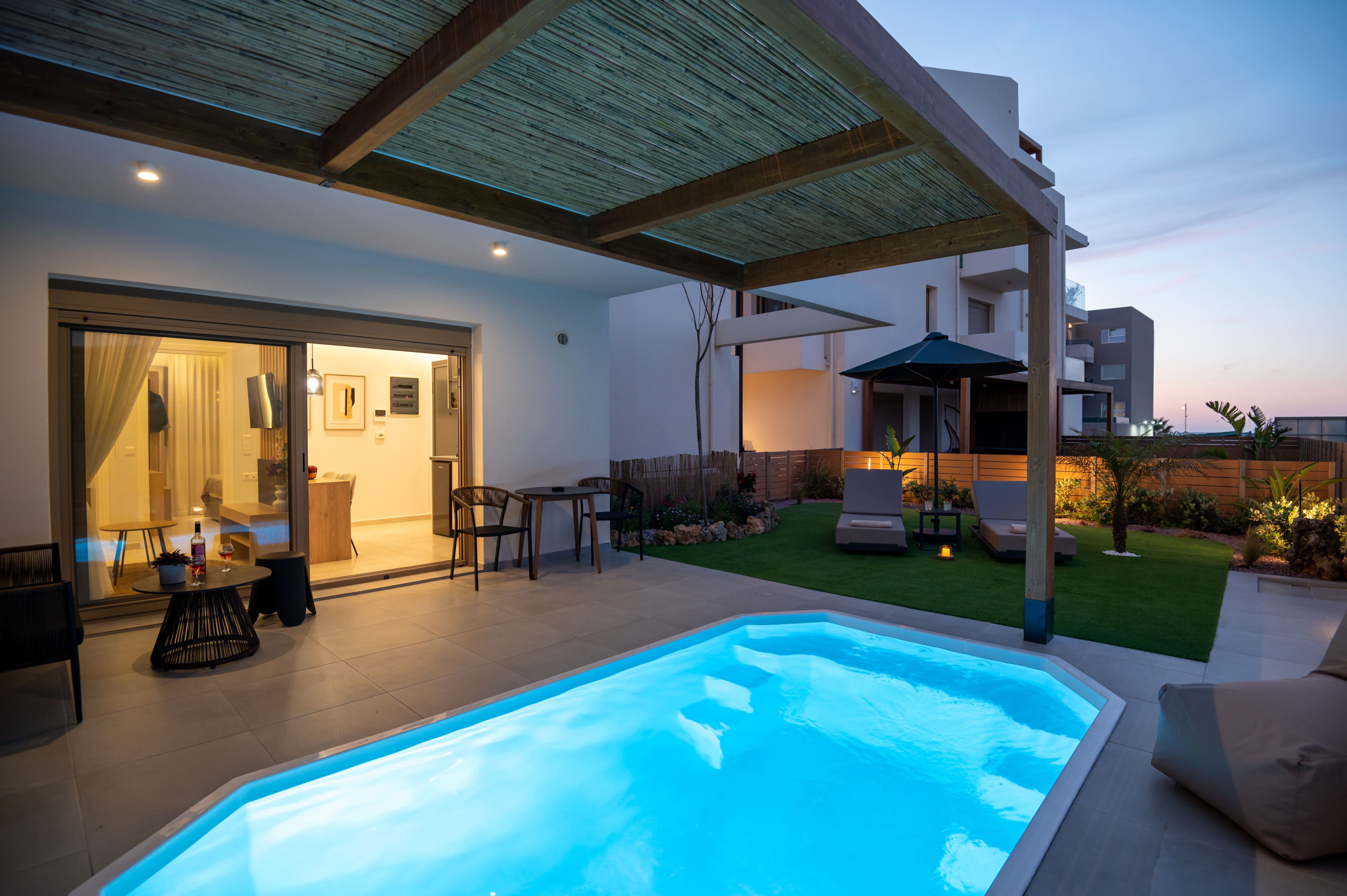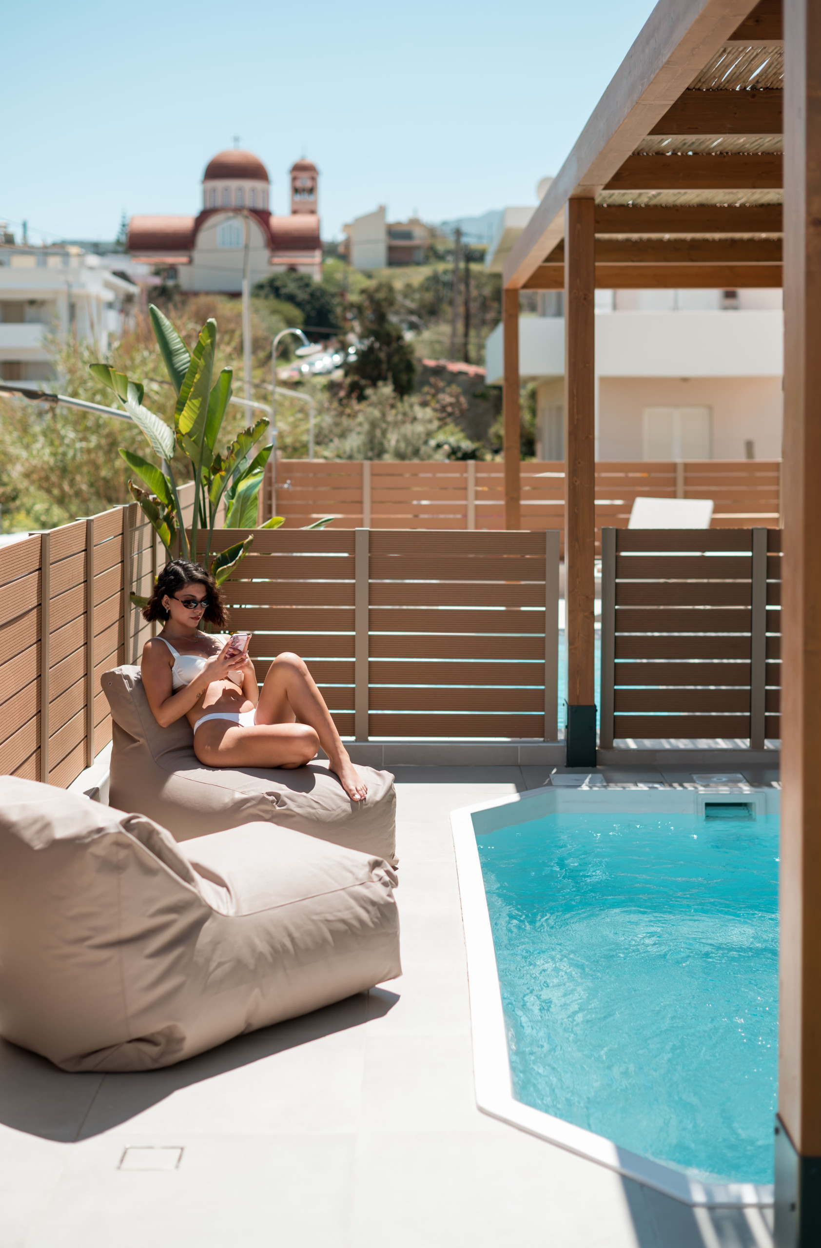 Located steps from Rethymno Beach, Azura Mare is a newly built 35 sqm design-led retreat. Curated for guests seeking elevated aesthetics in a compact footprint, this premium suite functions as a refined coastal base. It features a private, built-in heated mini pool and a bespoke kitchenette, blending immediate beach access (50 meters) with a secluded sanctuary environment and the rare convenience of dedicated on-site parking.