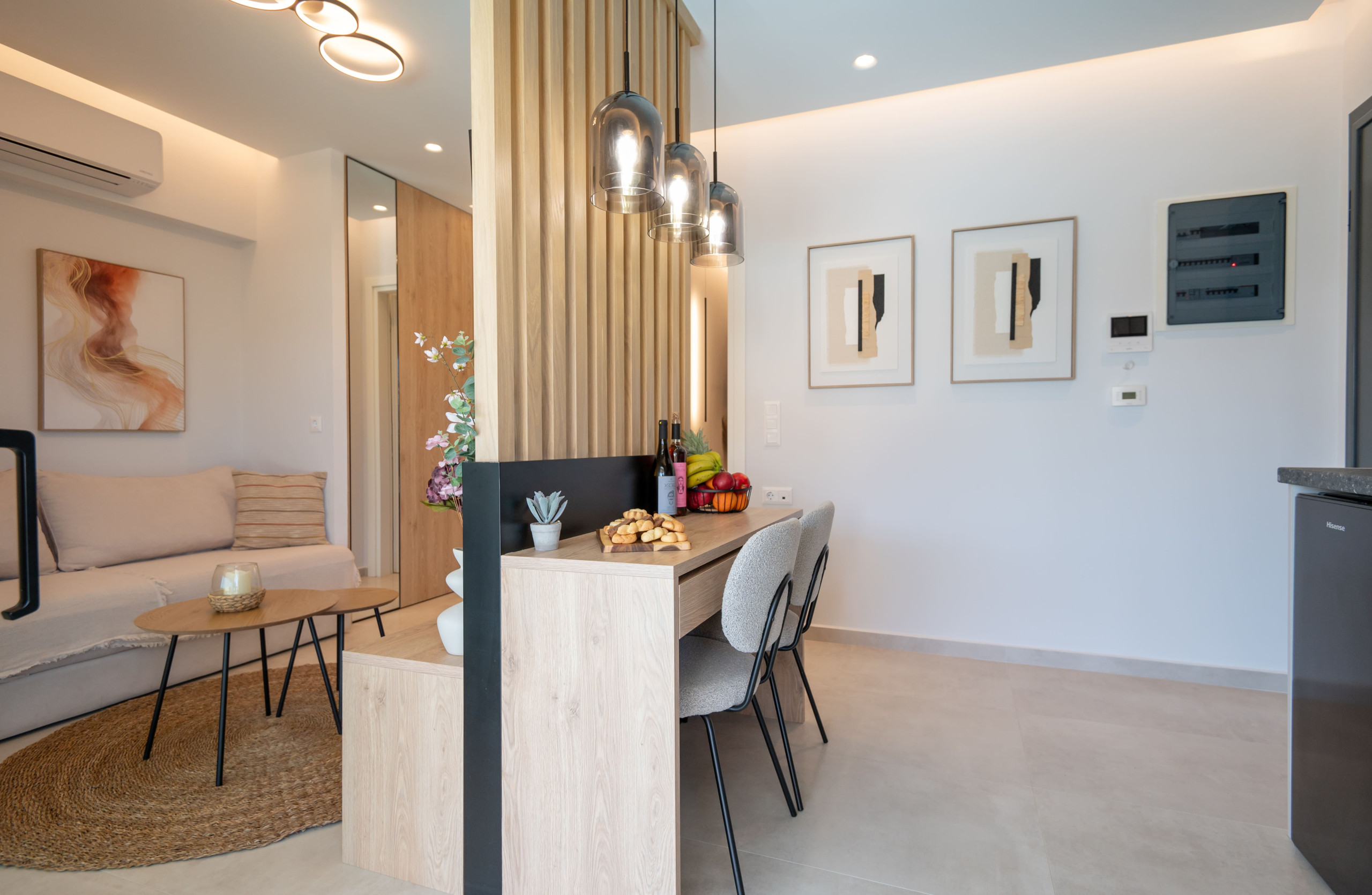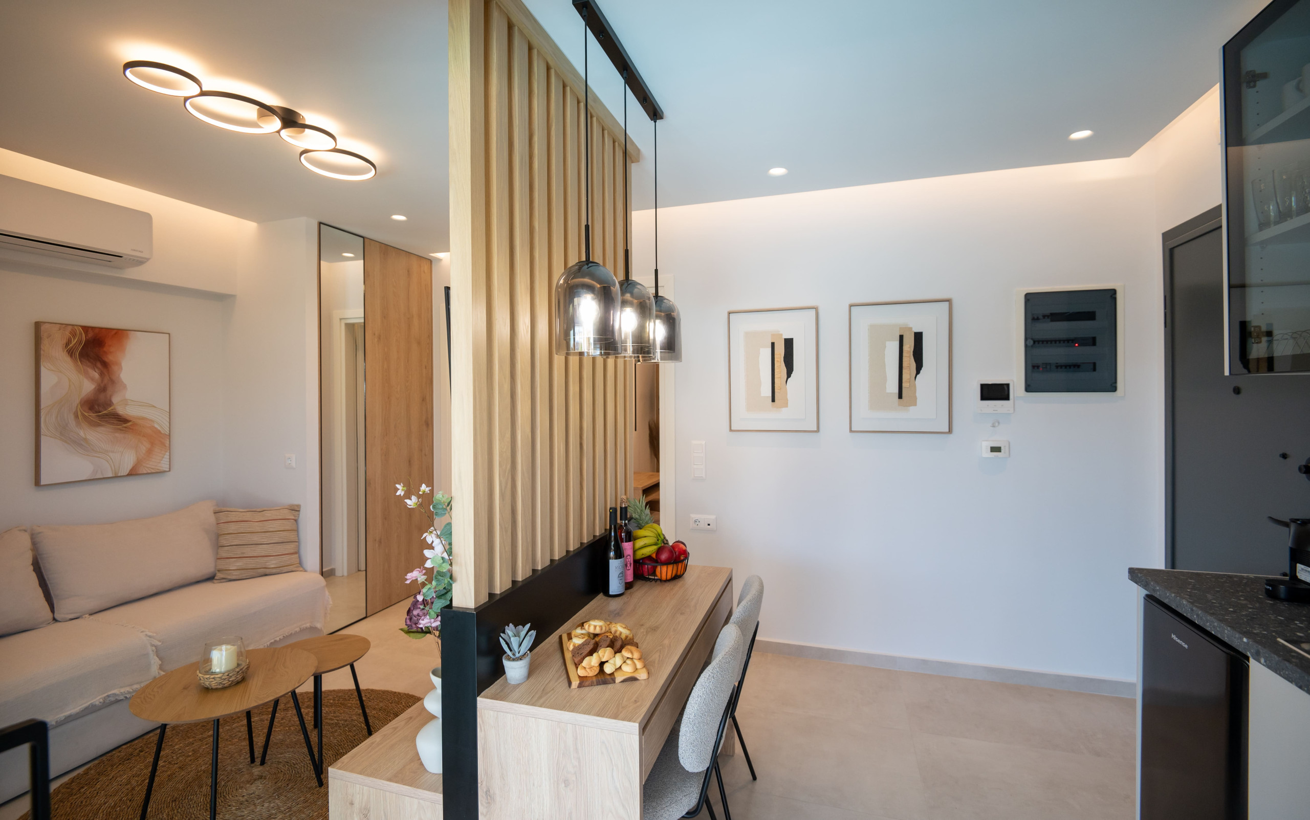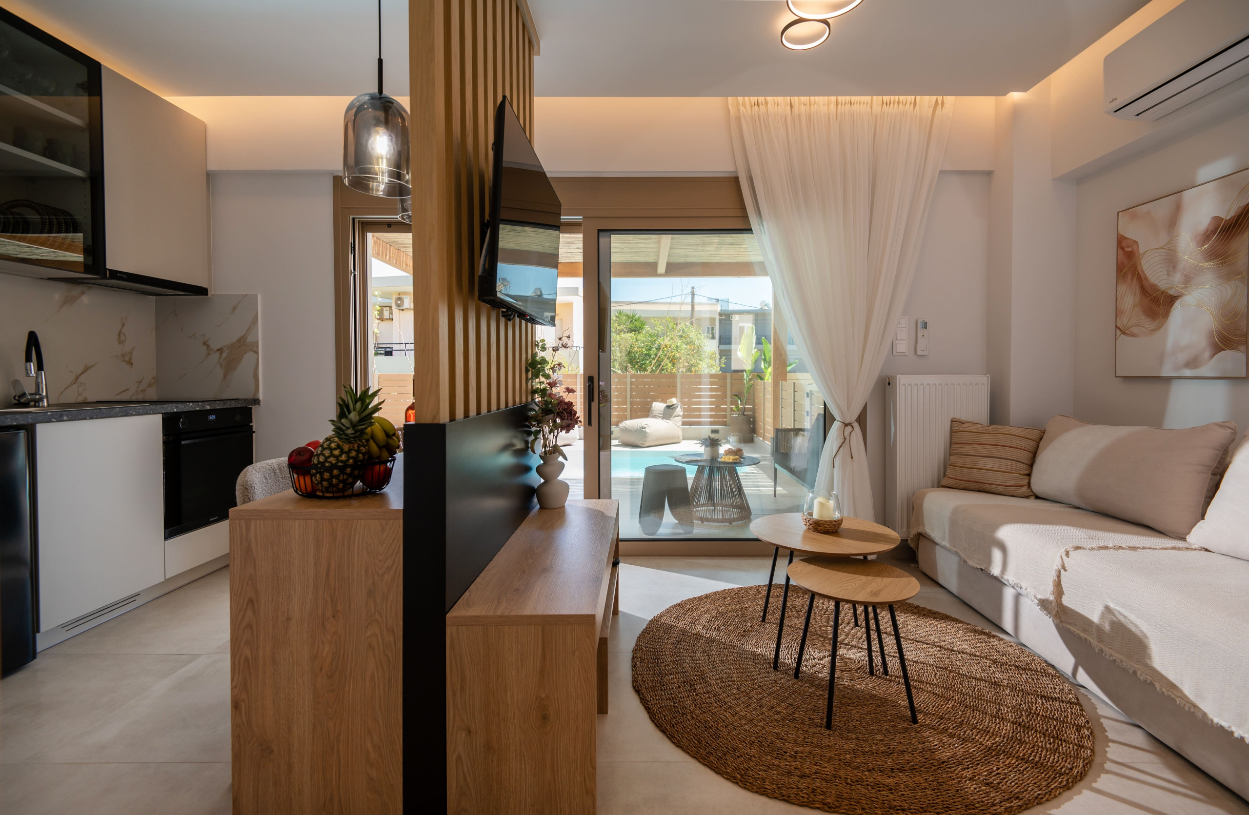 The 35 sqm floor plan is meticulously designed for simplicity as an open-plan studio. Given its ground-floor, central location near the beach, Rethymno Old Town and local amenities are within immediate reach, making a rental car strictly optional for daily exploration.