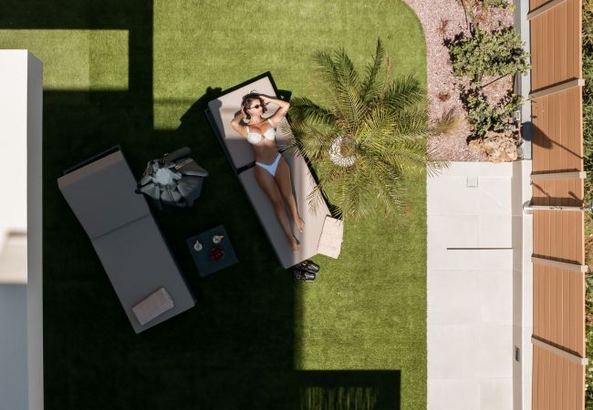 Comfortable outdoor seating and relaxation area (including sun loungers and wicker seating).