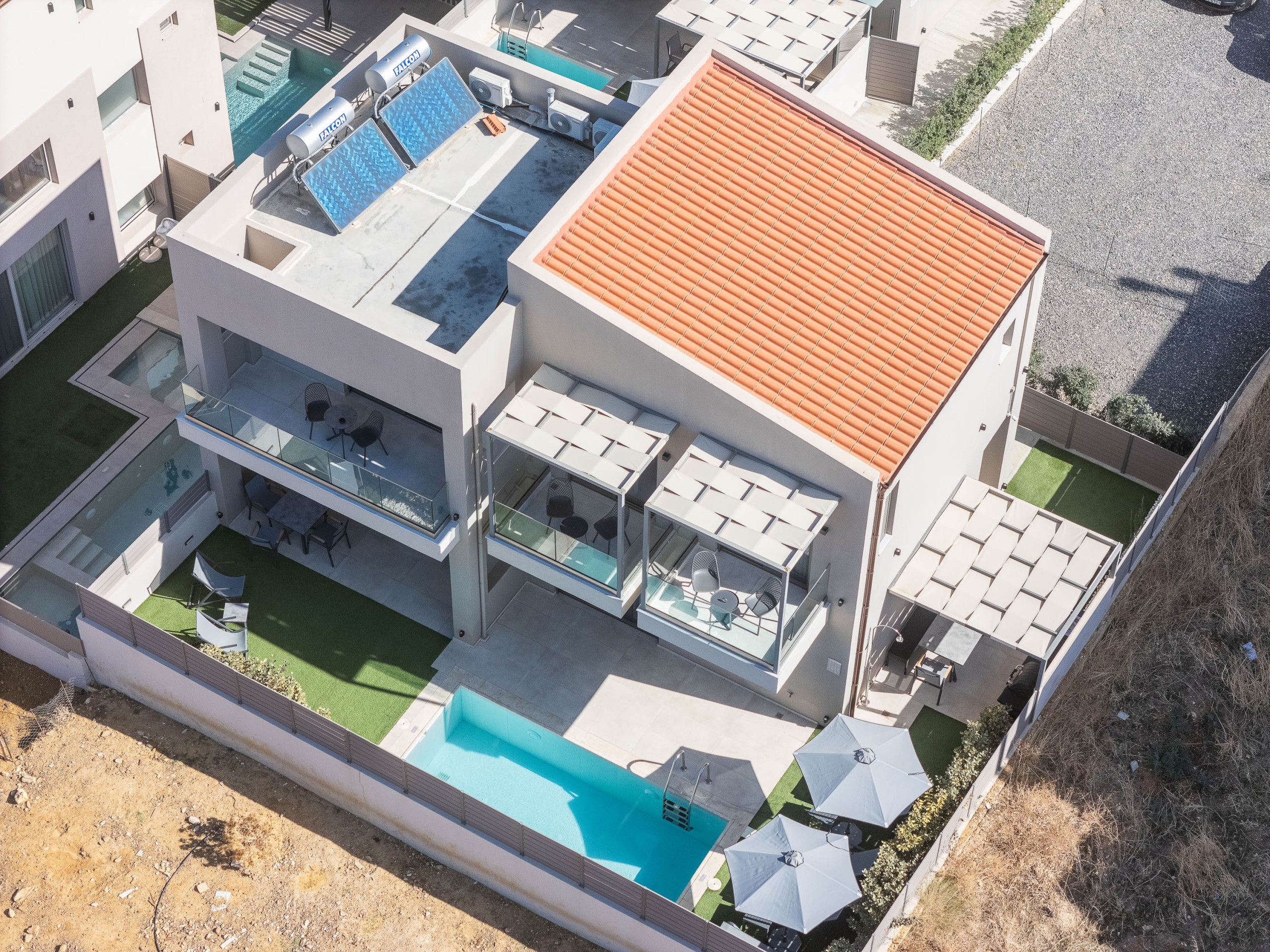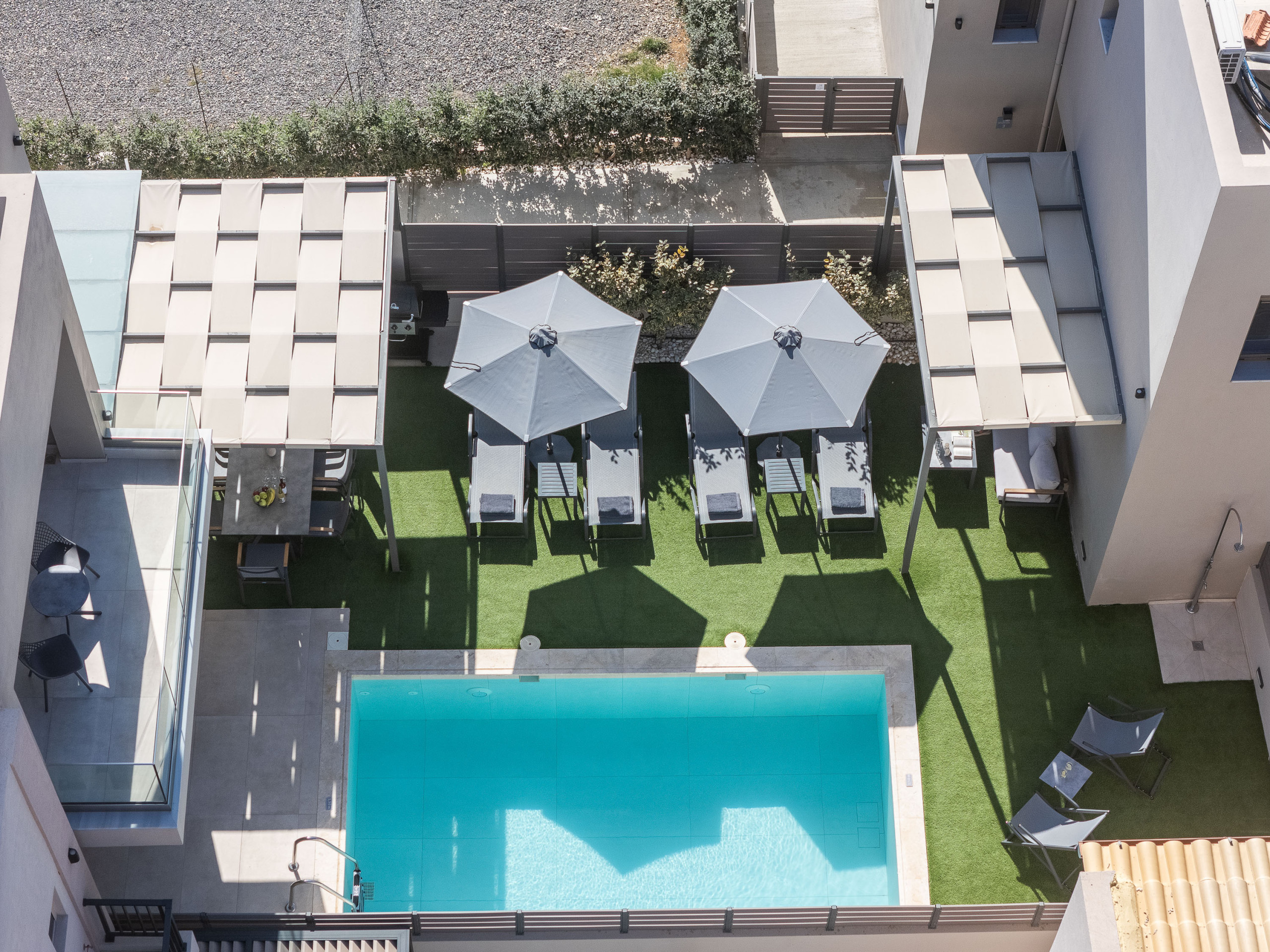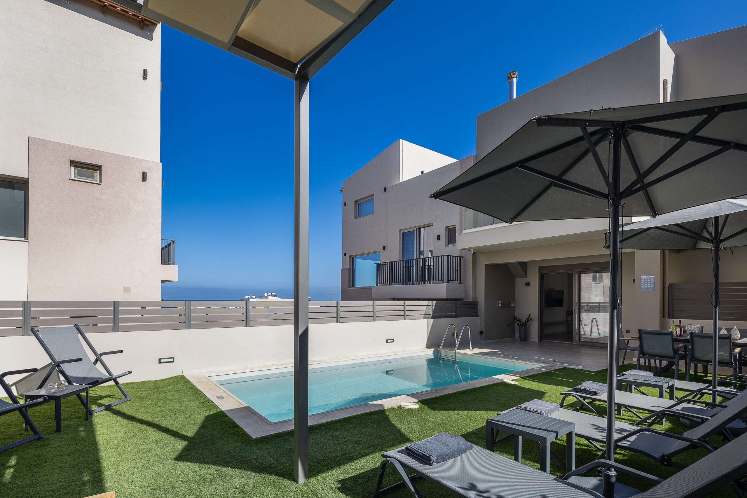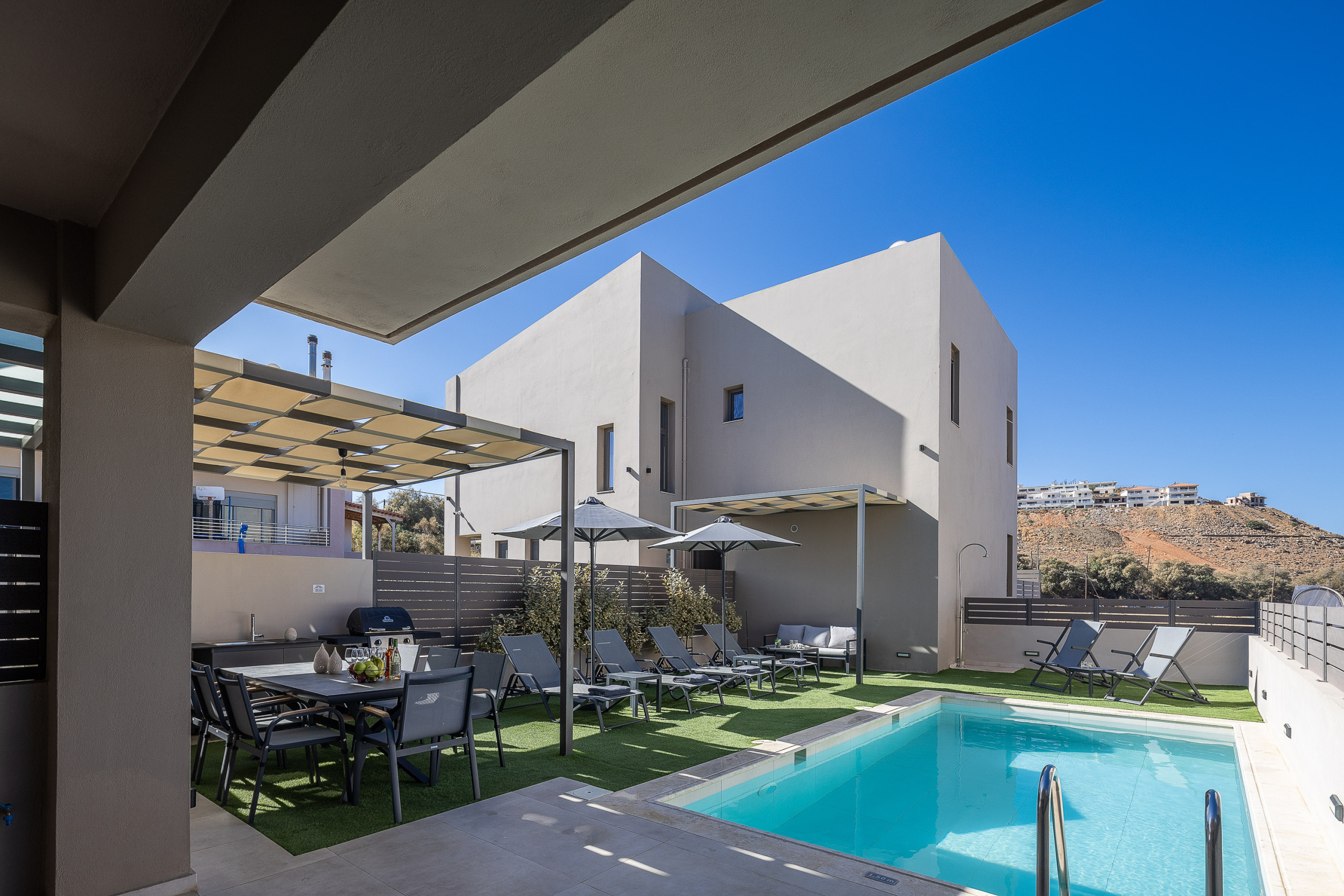 For families that travel together, but still value their own space. For friends who want to share mornings by the pool and quiet nights on their private balconies. This dual-villa residence in Panormos offers the best of both: togetherness and independence.